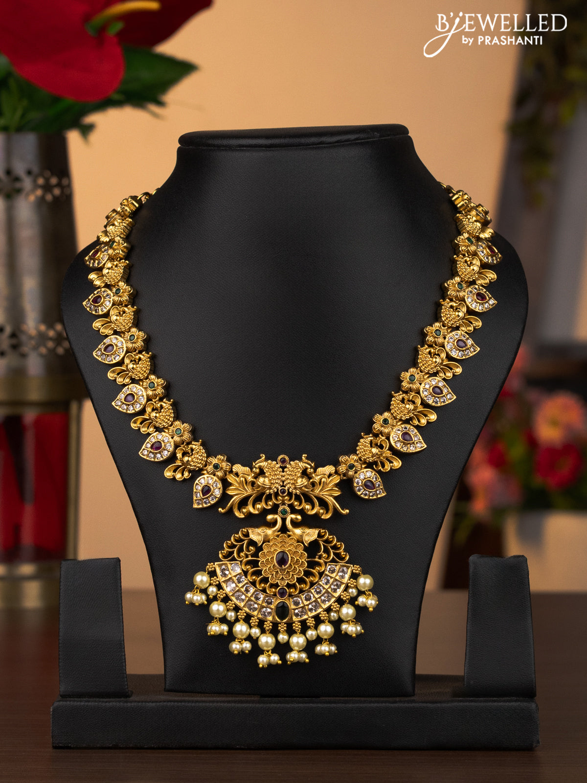 Antique necklace peacock & manga design with kemp & cz stones and pearl hangings without earrings