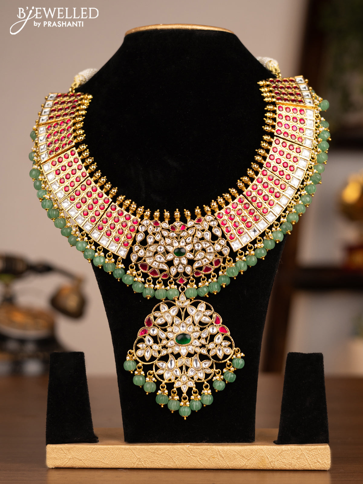 Antique necklace with jadau kundan stones and pearl & pumpkin beads hanging without earrings