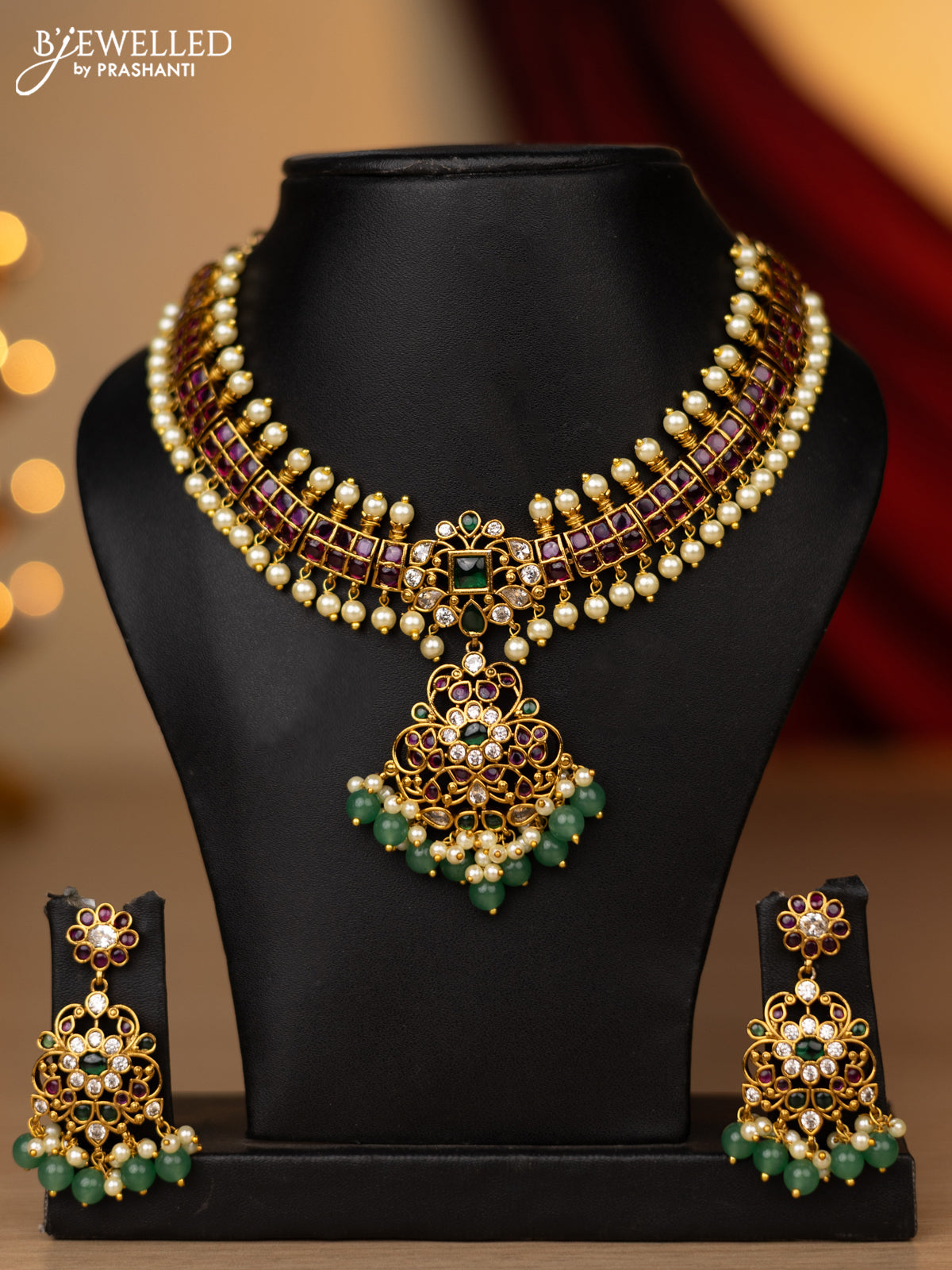 Antique necklace with kemp & cz stones and pearl & green beads hanging