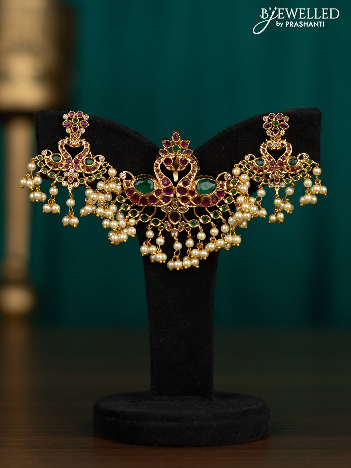 Antique pendant set double peacock design with kemp & cz stones and pearl hangings