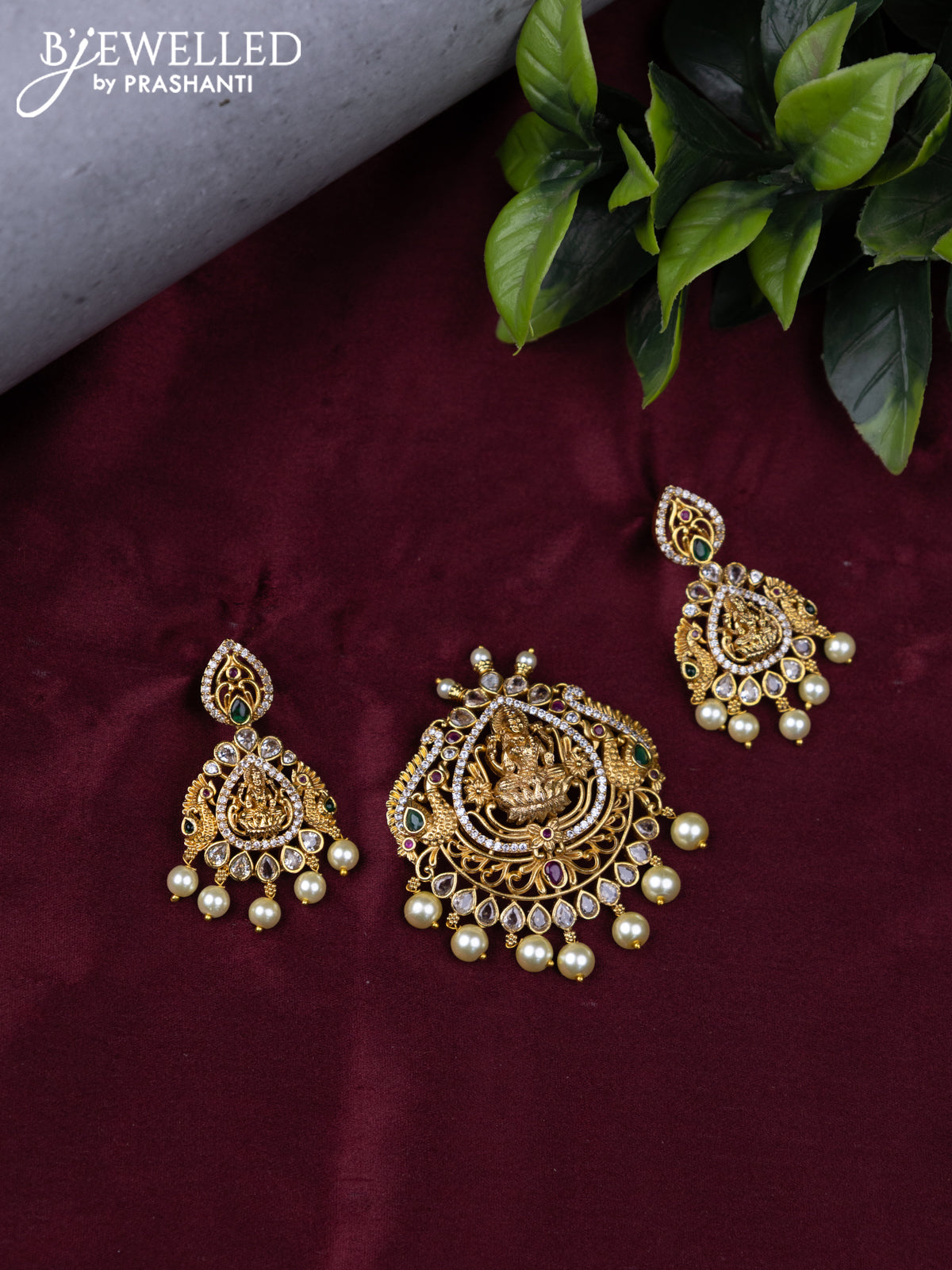 Antique pendant set lakshmi design with kemp & cz stones and pearl hangings