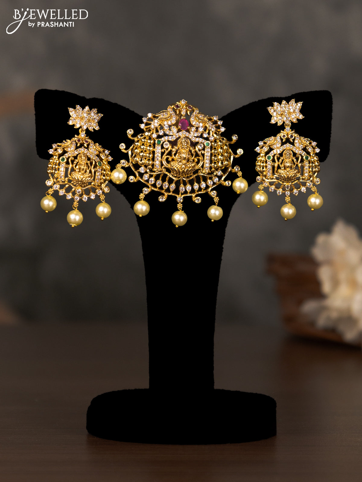 Antique pendant set lakshmi design with kemp & cz stones and pearl hangings