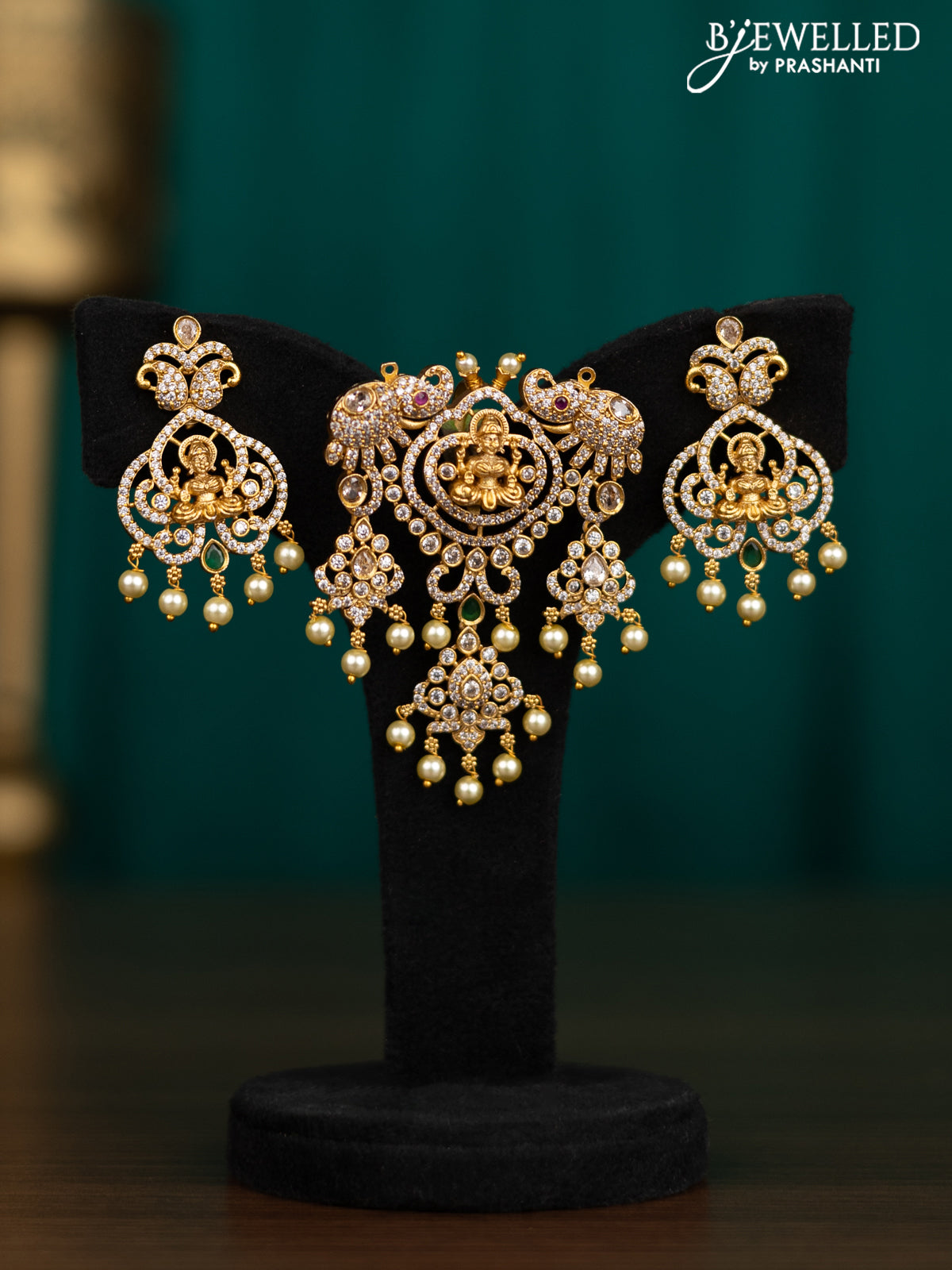 Antique pendant set lakshmi design with kemp & cz stones and pearl hangings