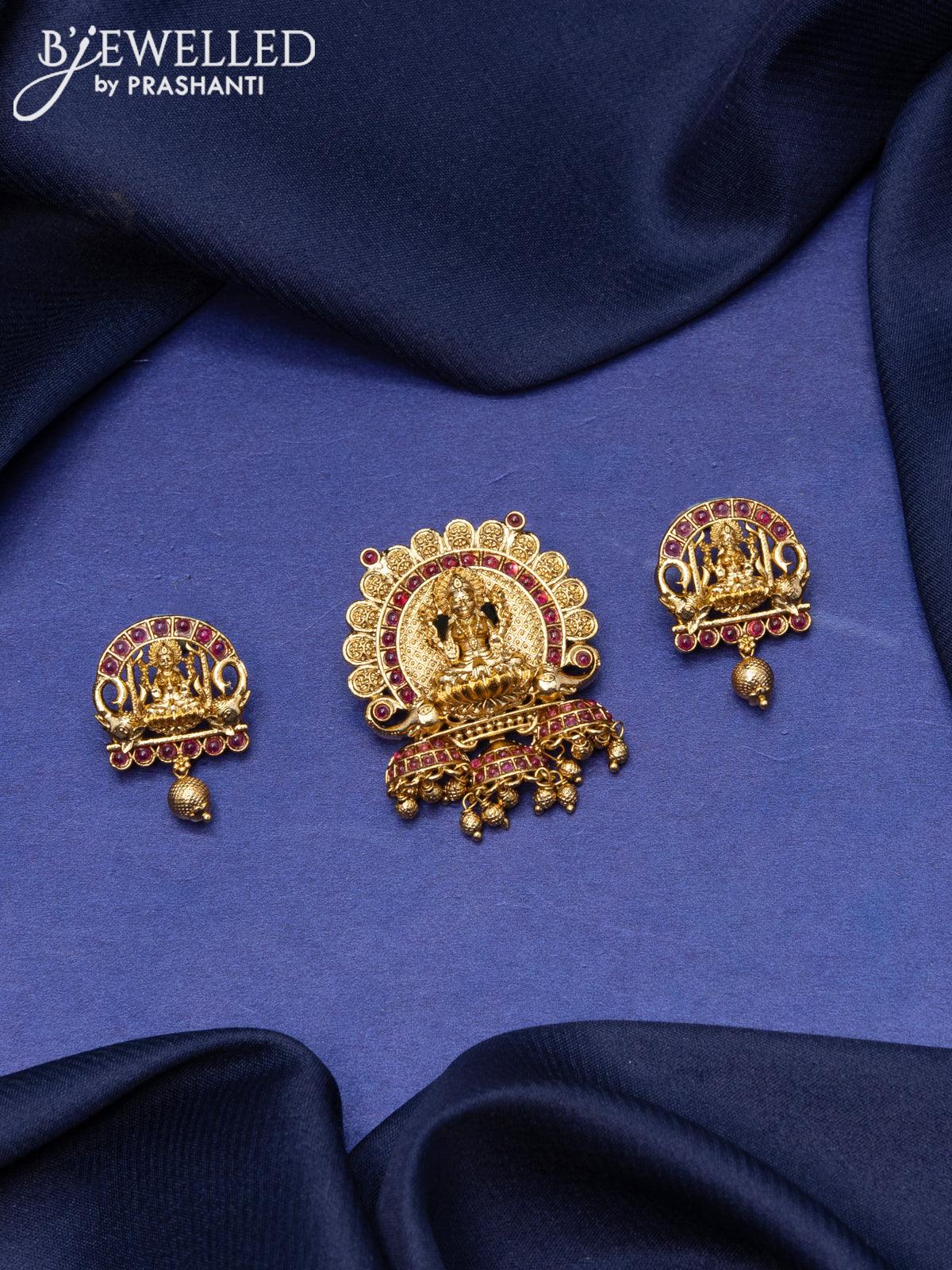 Antique pendant set lakshmi design with pink kemp stones and golden beads hangings