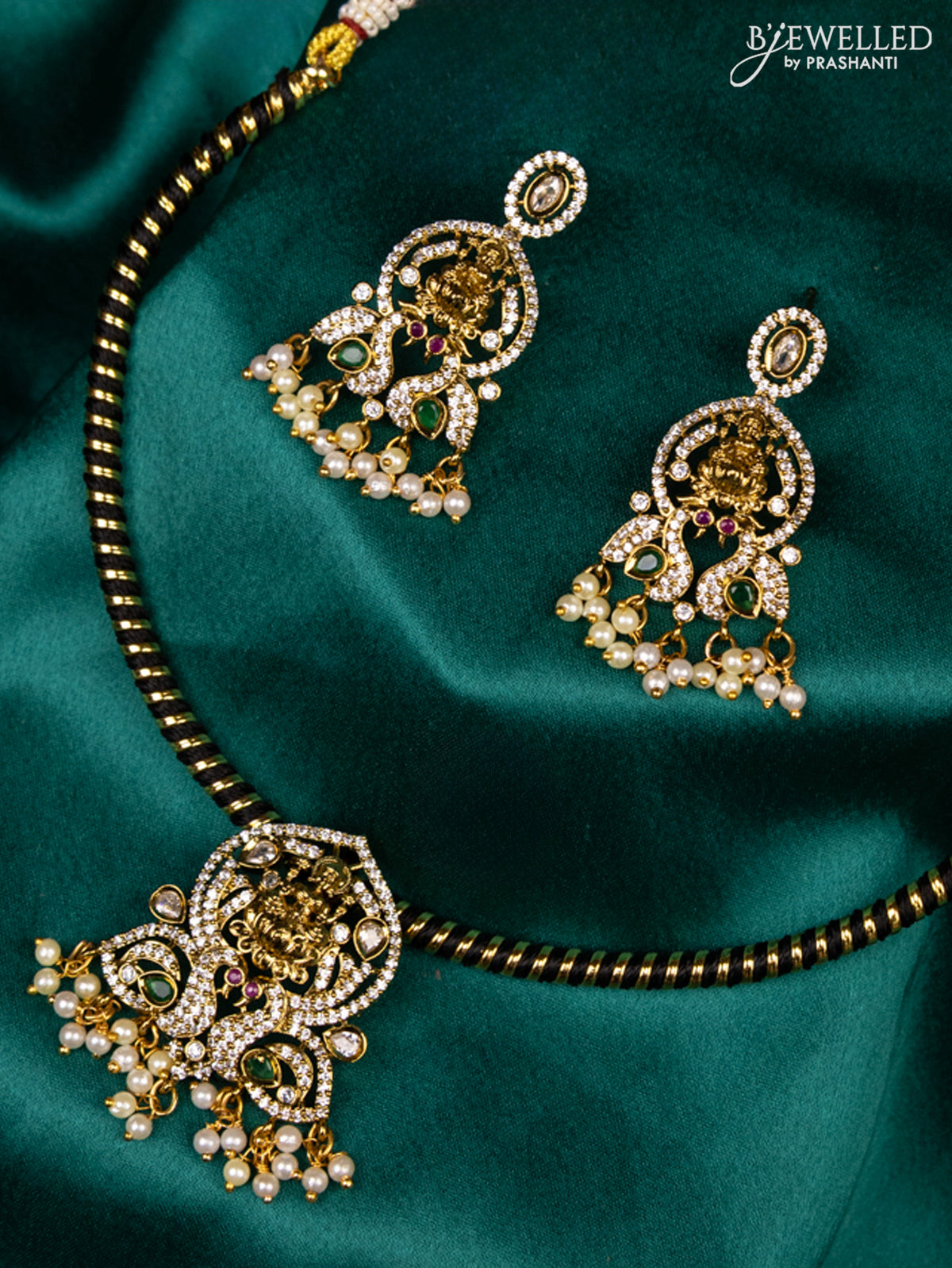 Antique ring type choker green kemp & cz stone with lakshmi pendant and pearl hangings
