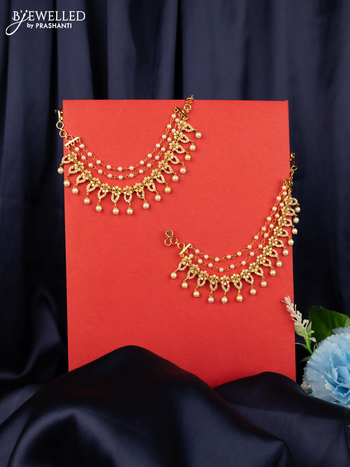 Antique triple layer maatal floral design with kemp & cz stones and pearl hangings