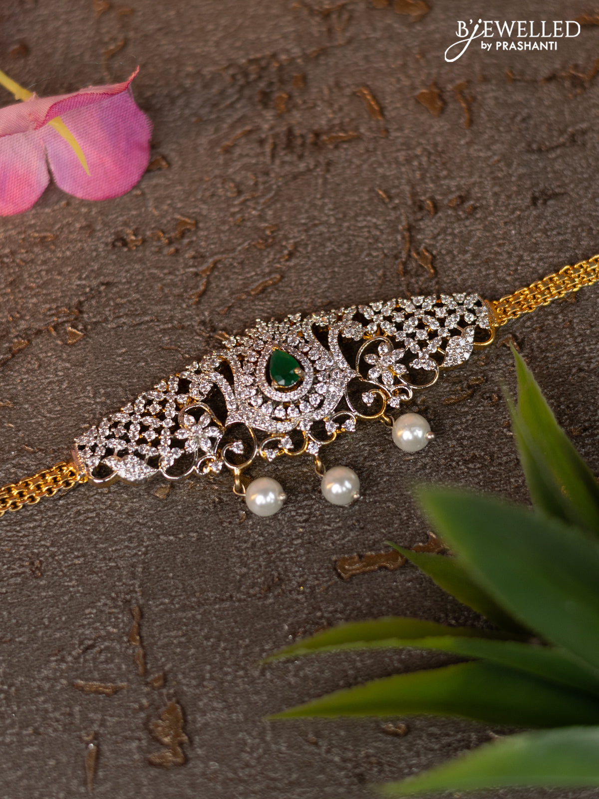 Zircon vanki with emerald & cz stones and pearl hangings in gold finish
