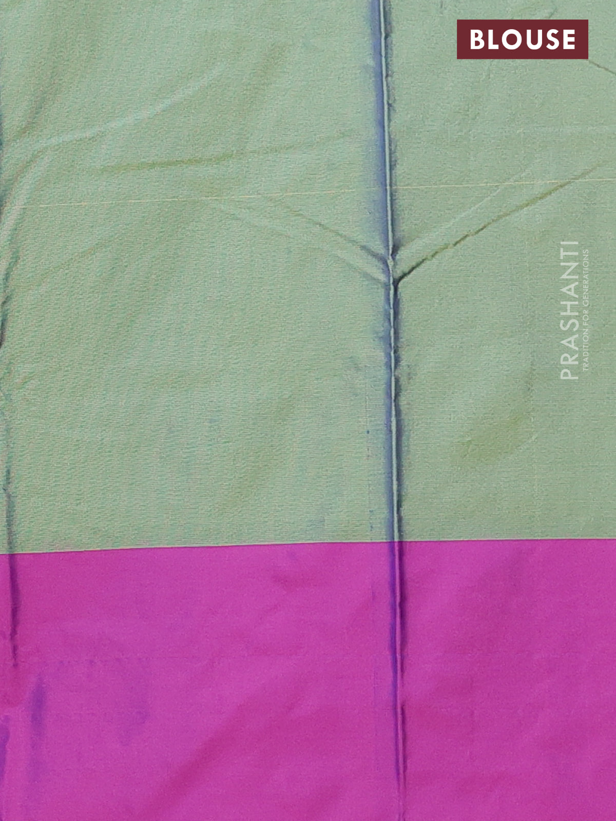 Arani semi silk saree dual shade of green and purple with allover copper zari weaves and zari checked border