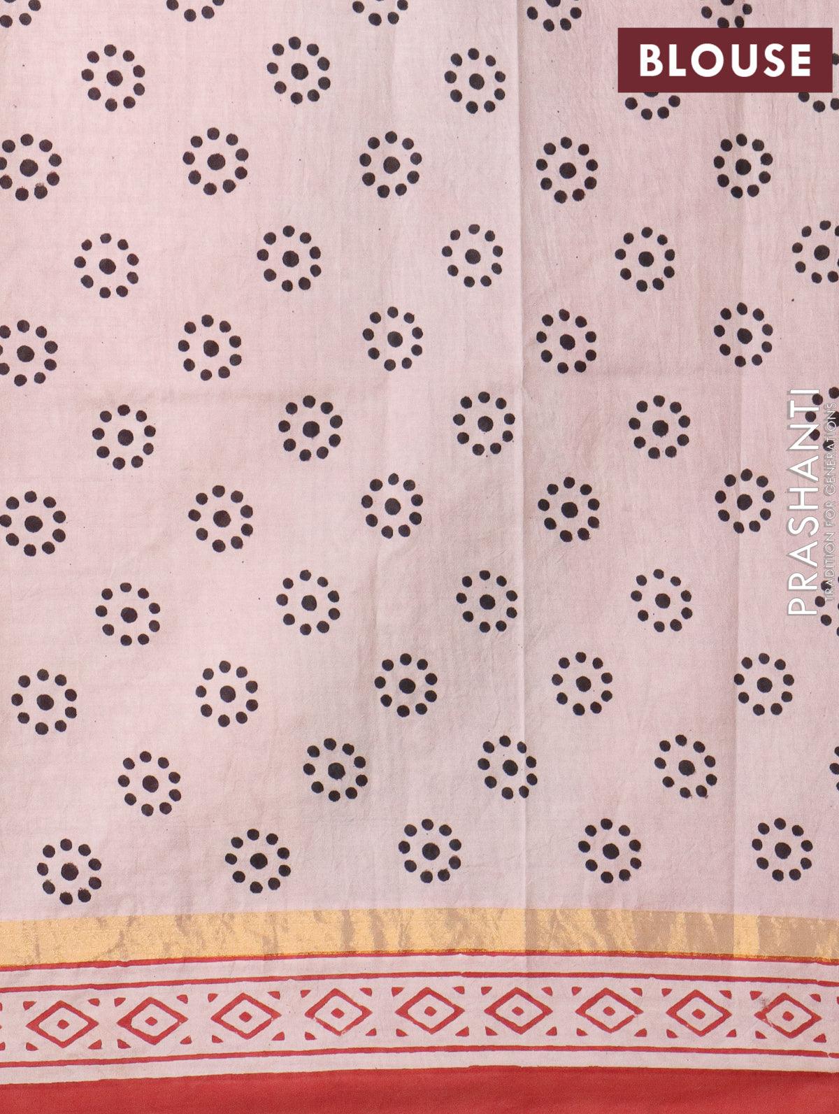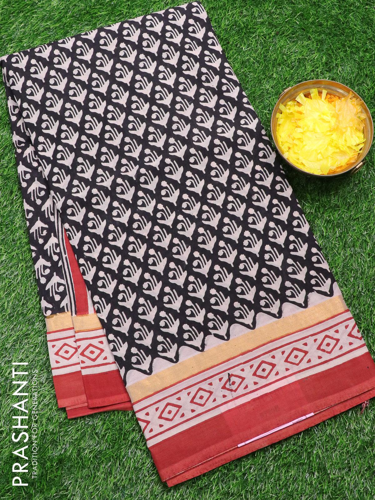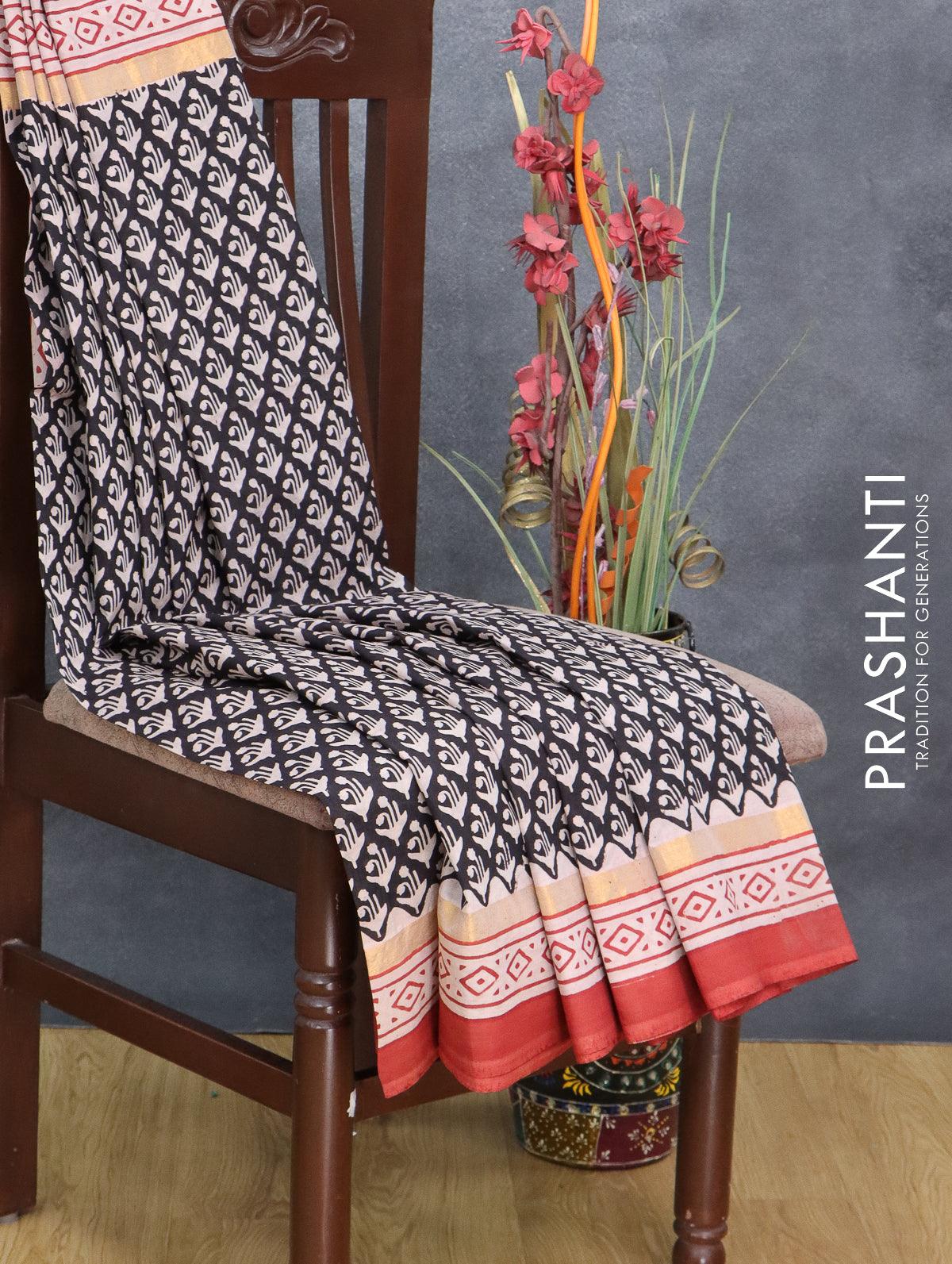 Assam silk saree black and rust shade with allover prints and zari woven simple border