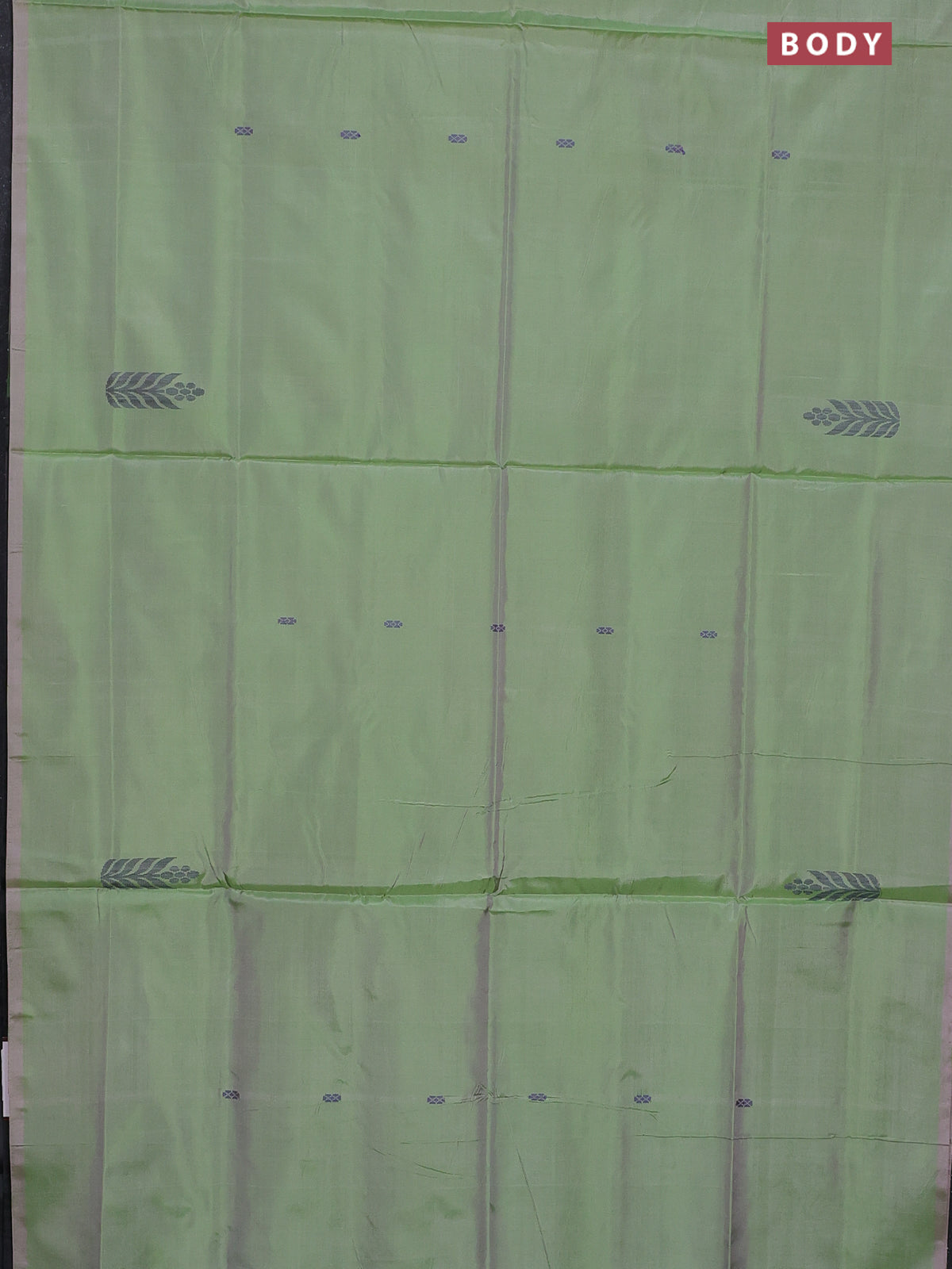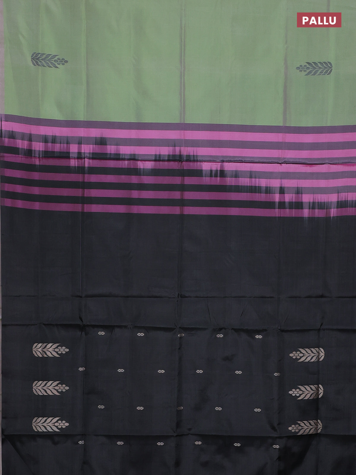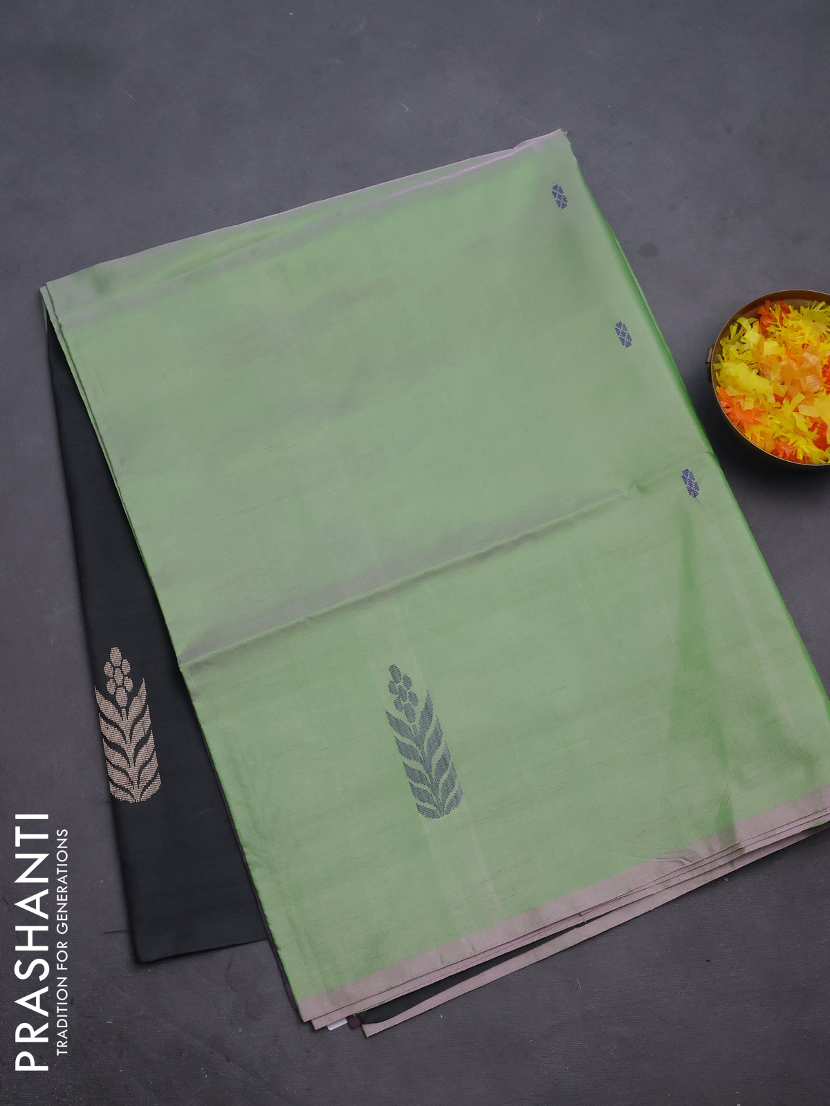 Banana pith saree dual shade of light green and black with thread woven buttas in borderless style