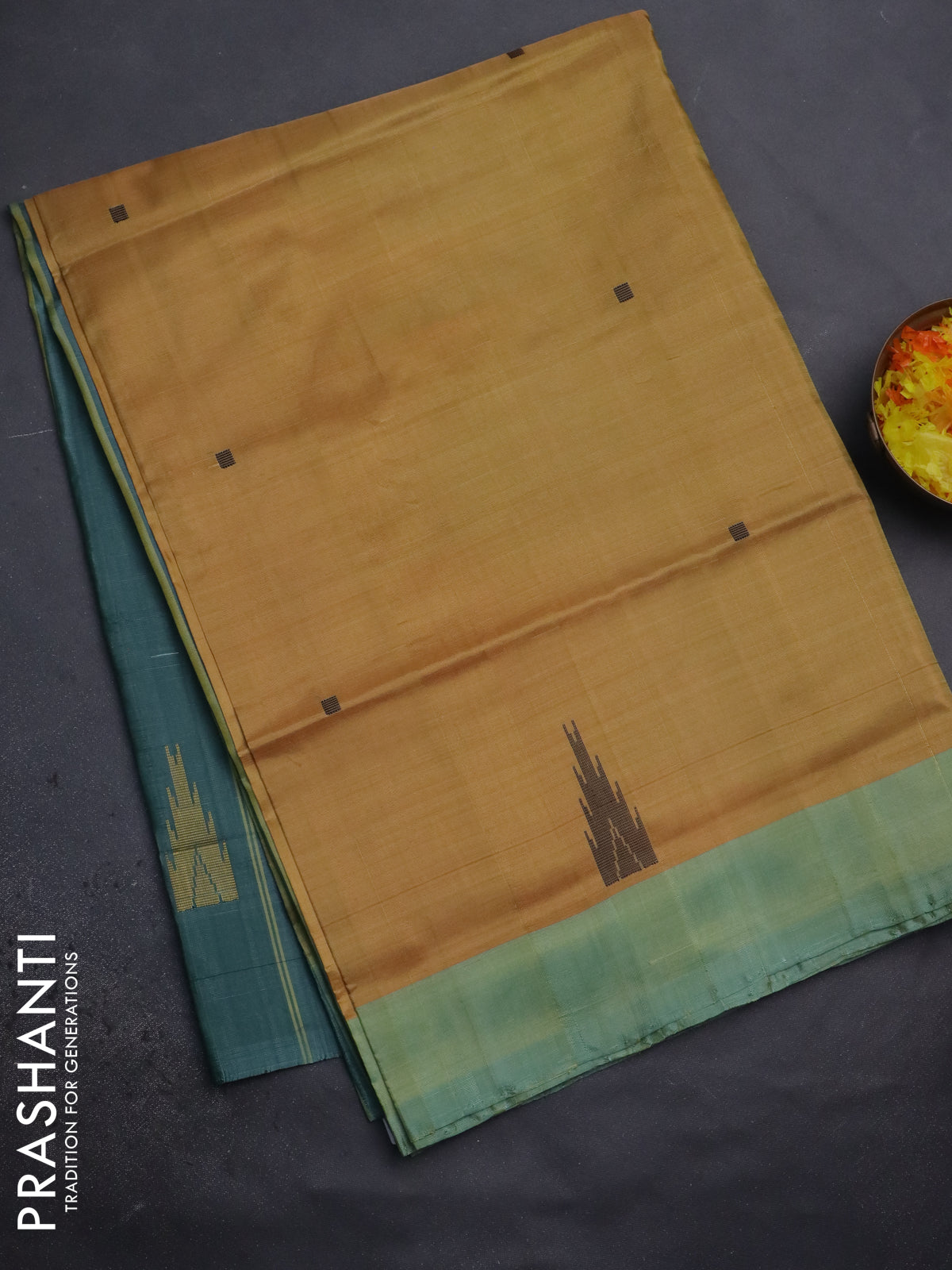 Banana pith saree mustard yellow and peacock green with thread woven buttas and contrast border
