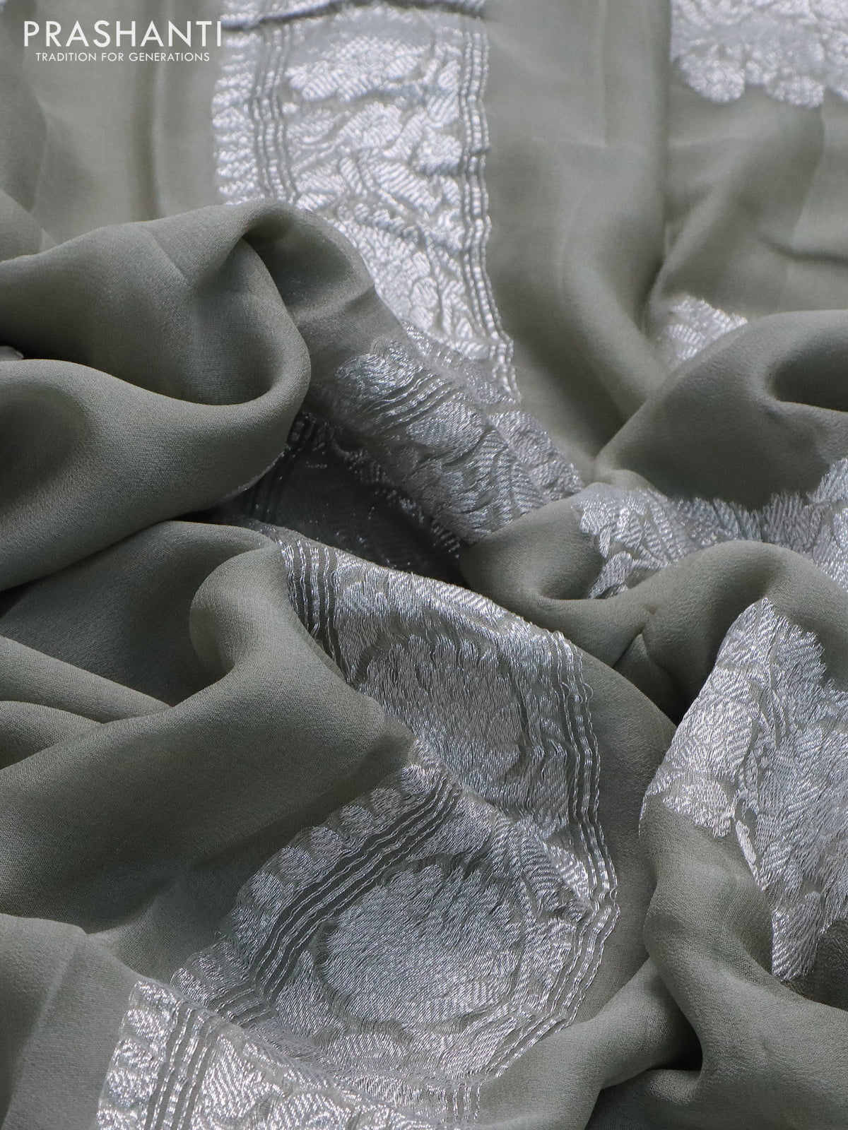 Banarasi chiffon saree grey shade with silver zari woven buttas and silver zari woven border