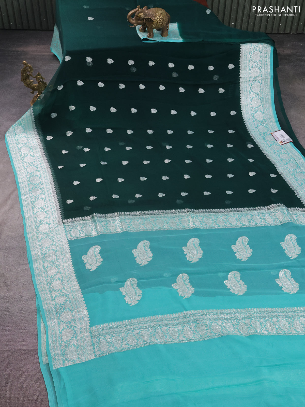 Banarasi chiffon silk saree bottle green and teal blue with silver zari woven buttas and silver zari woven border