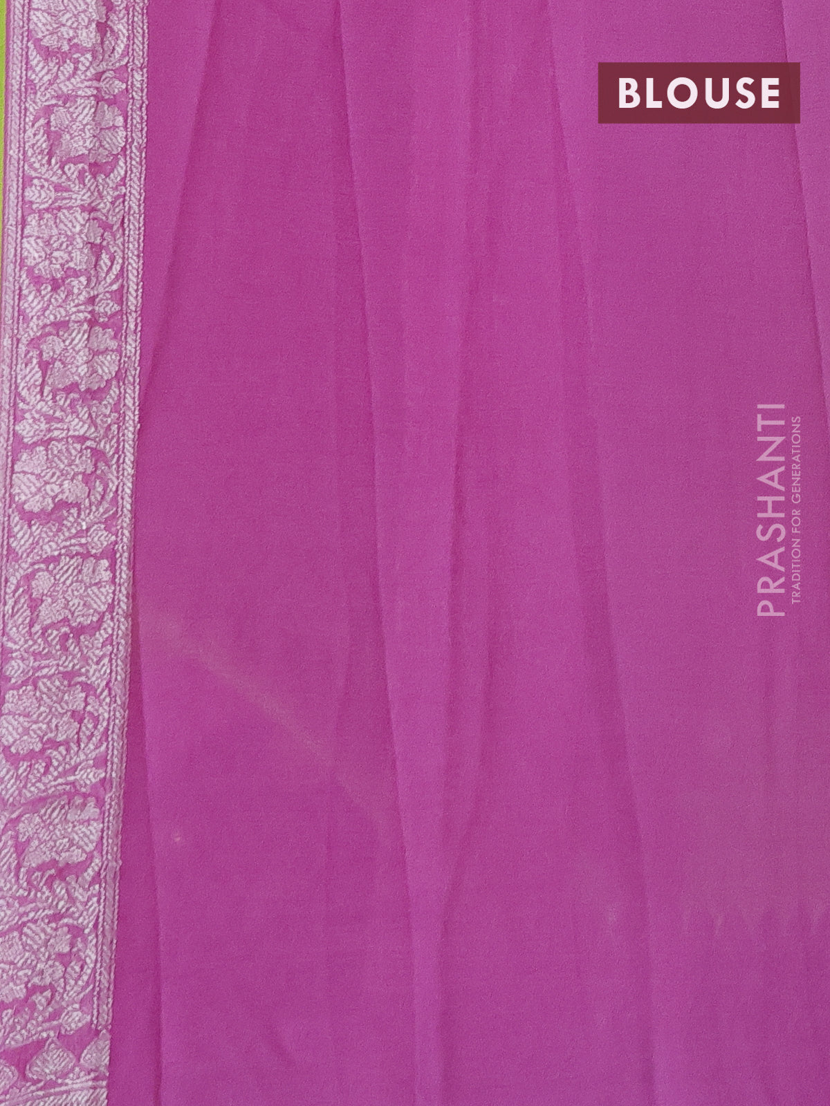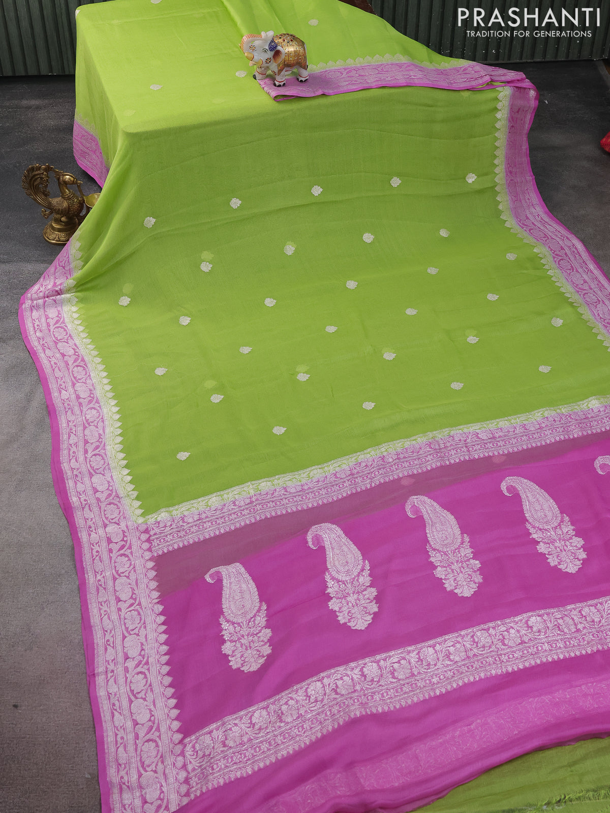 Banarasi chiffon silk saree lime green and lotus pink with silver zari woven buttas and silver zari woven border