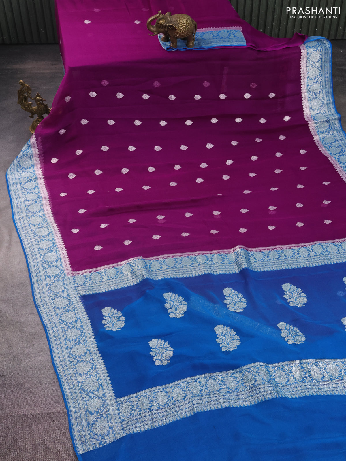 Banarasi chiffon silk saree purple and cs blue with silver zari woven buttas and silver zari woven border