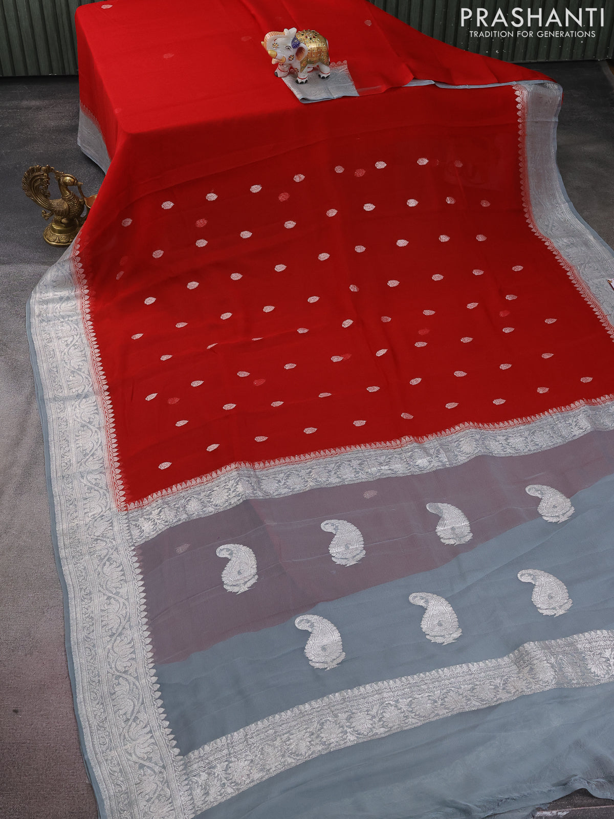 Banarasi chiffon silk saree red and grey with silver zari woven buttas and silver zari woven border