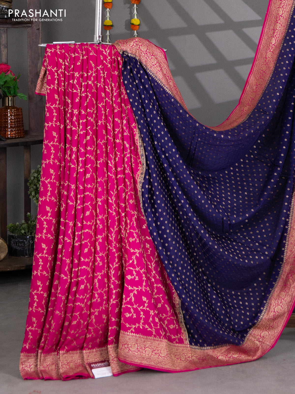 Pure Banarasi Crepe sarees featuring a fluid drape and graceful sheen, offering a perfect blend of heritage craftsmanship and modern elegance. Curated by Prashanti for effortless luxury and timeless style.