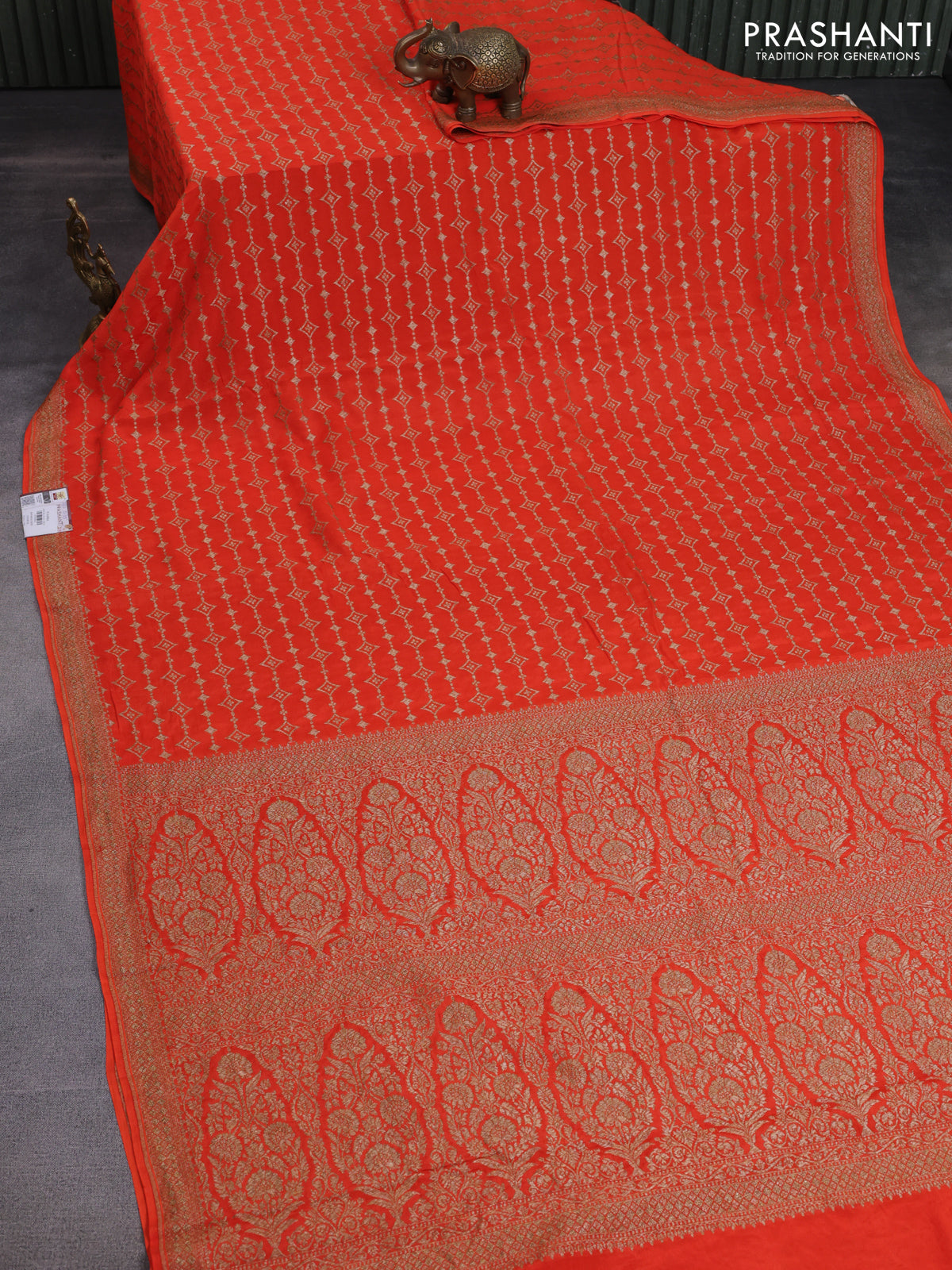 Banarasi crepe saree orange with allover thread & zari geometric weaves and woven border