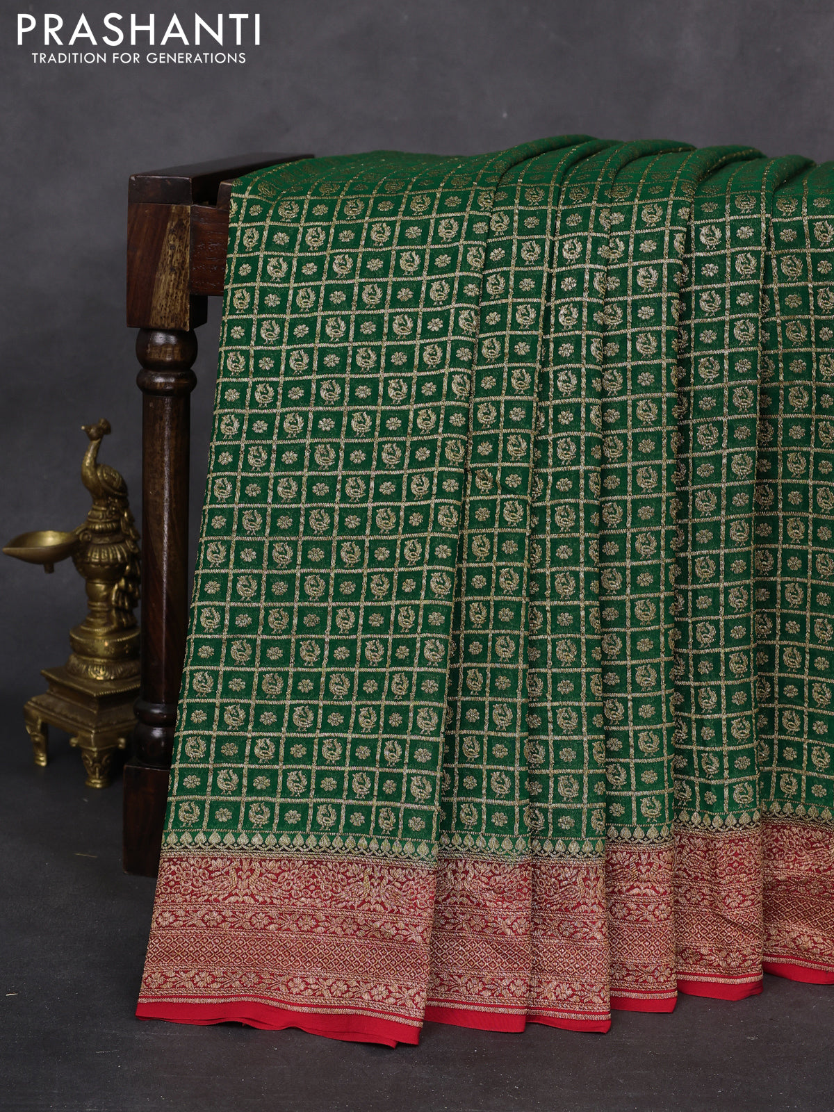 Banarasi georgette saree green and red with allover checked pattern & buttas and woven border