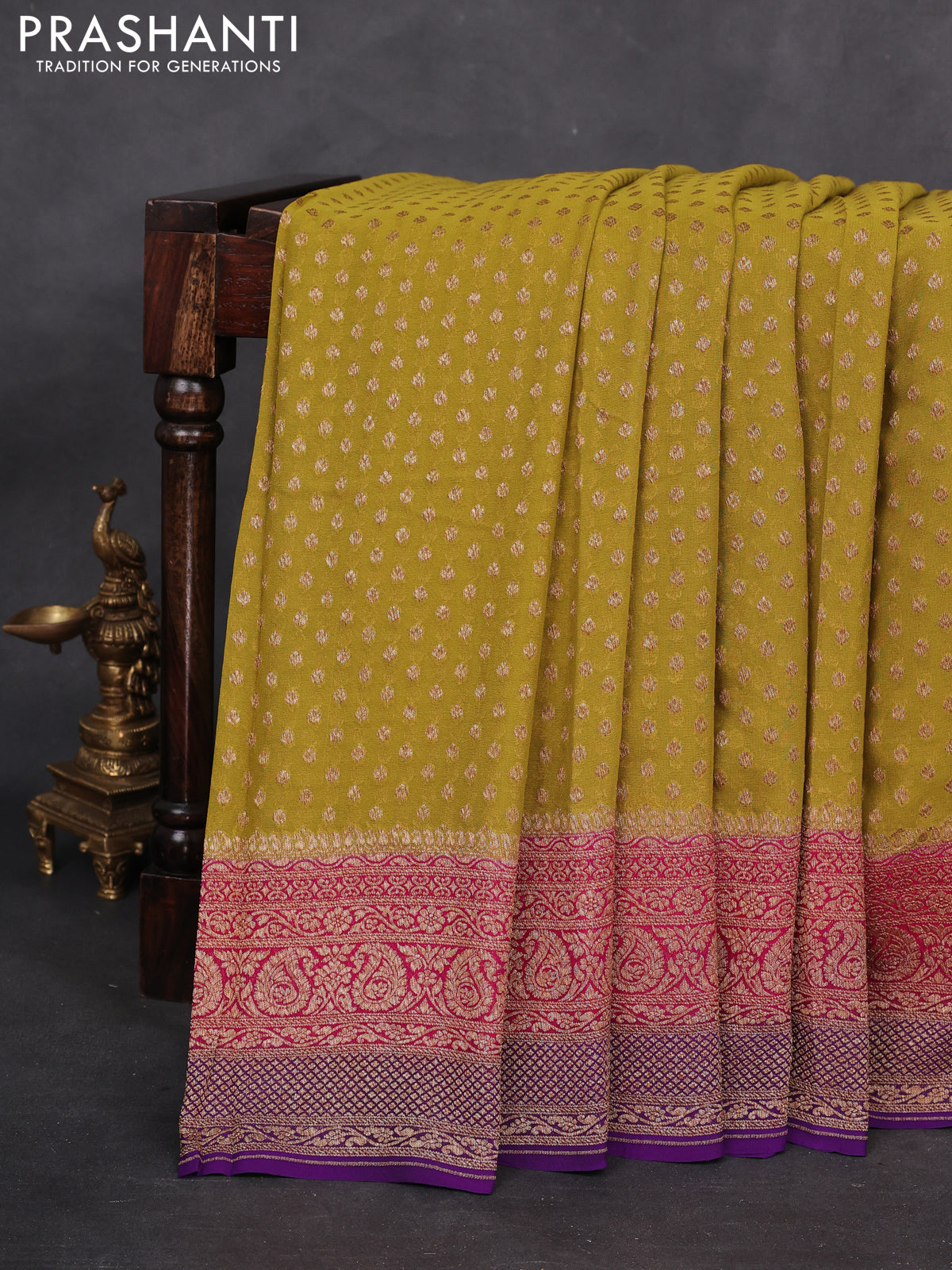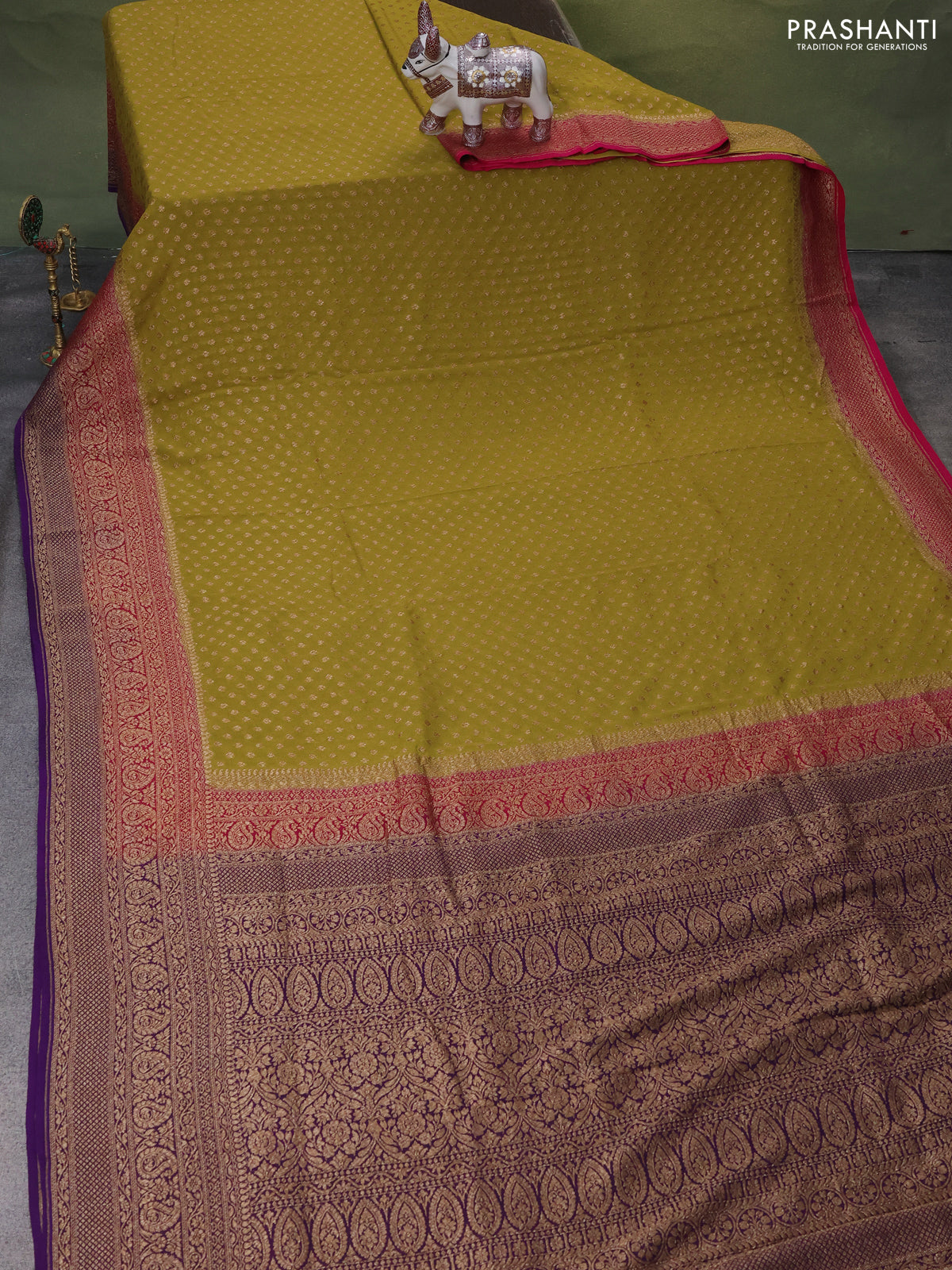 Banarasi georgette saree lime green and pink violet with allover woven buttas and woven border