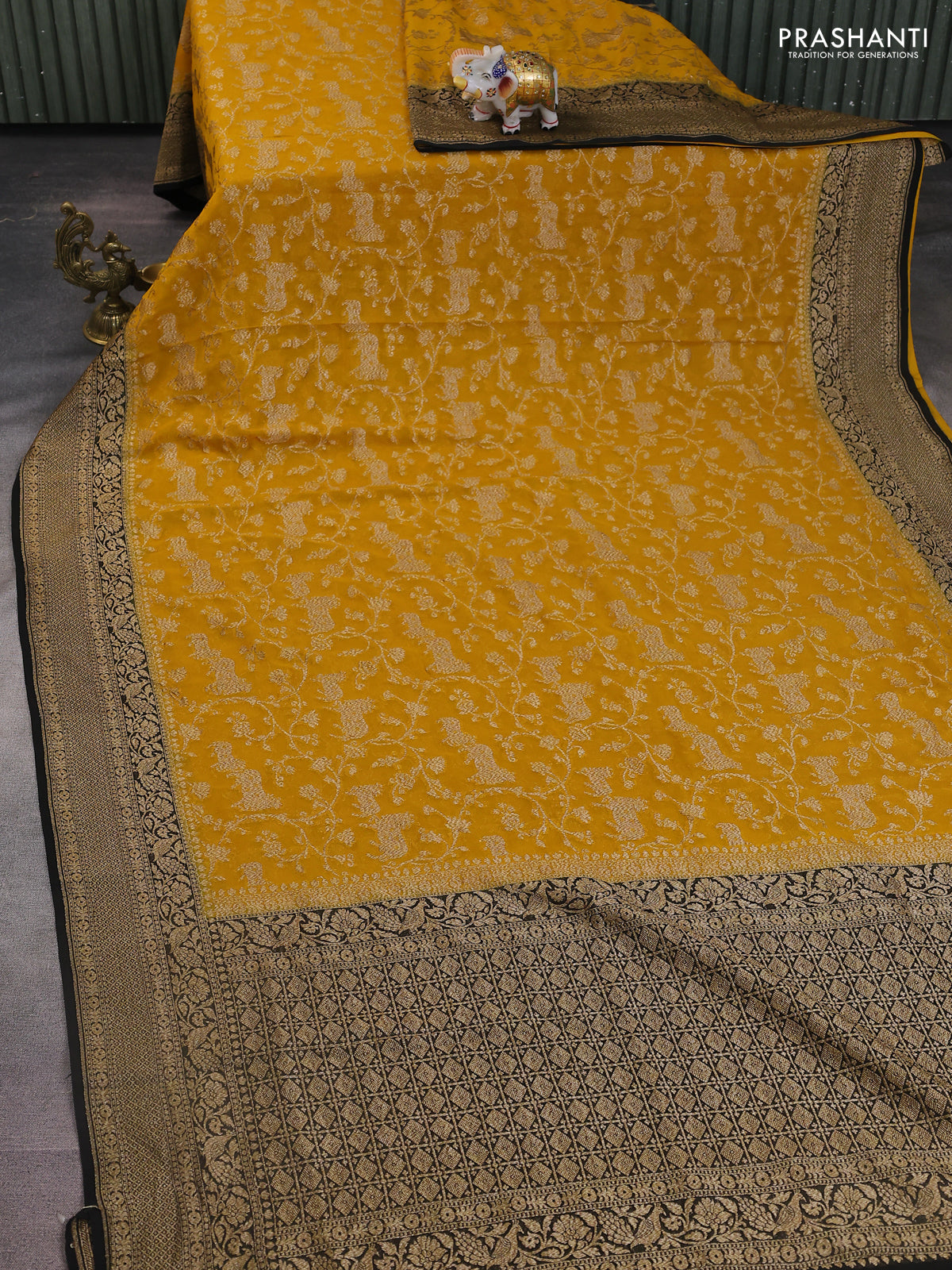 Banarasi georgette saree mustard yellow and black with allover thread & zari pichwai weaves and woven border