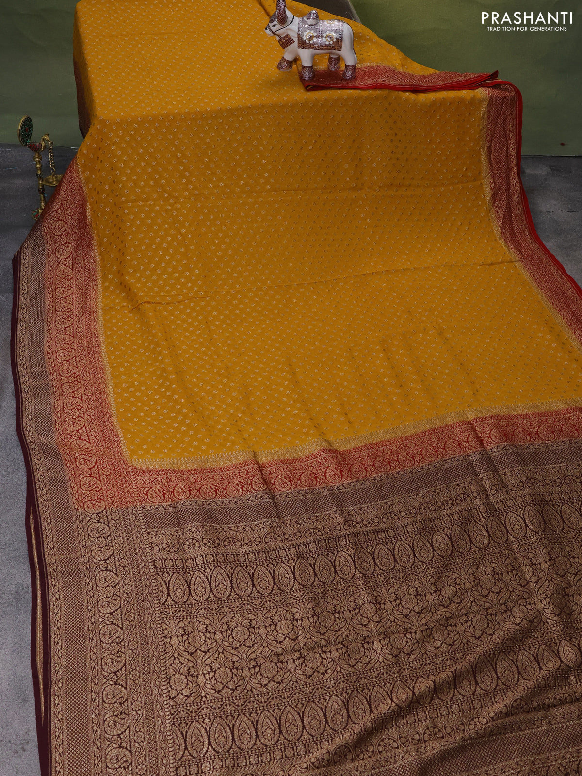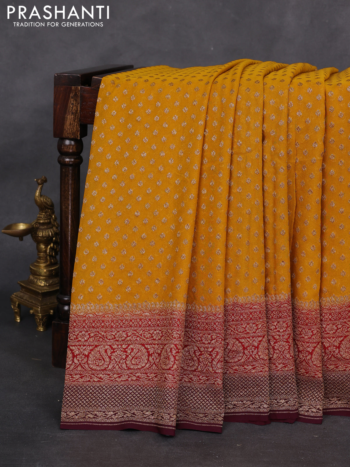 Banarasi georgette saree mustard yellow and red wine shade with allover woven buttas and woven border