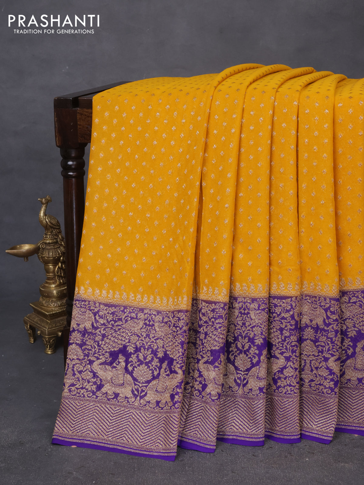 Banarasi georgette saree mustard yellow and violet with allover thread & zari butta weaves and long woven border