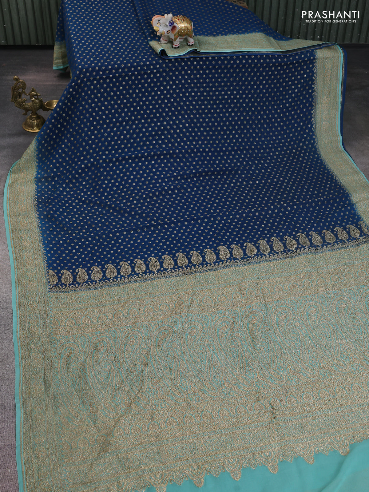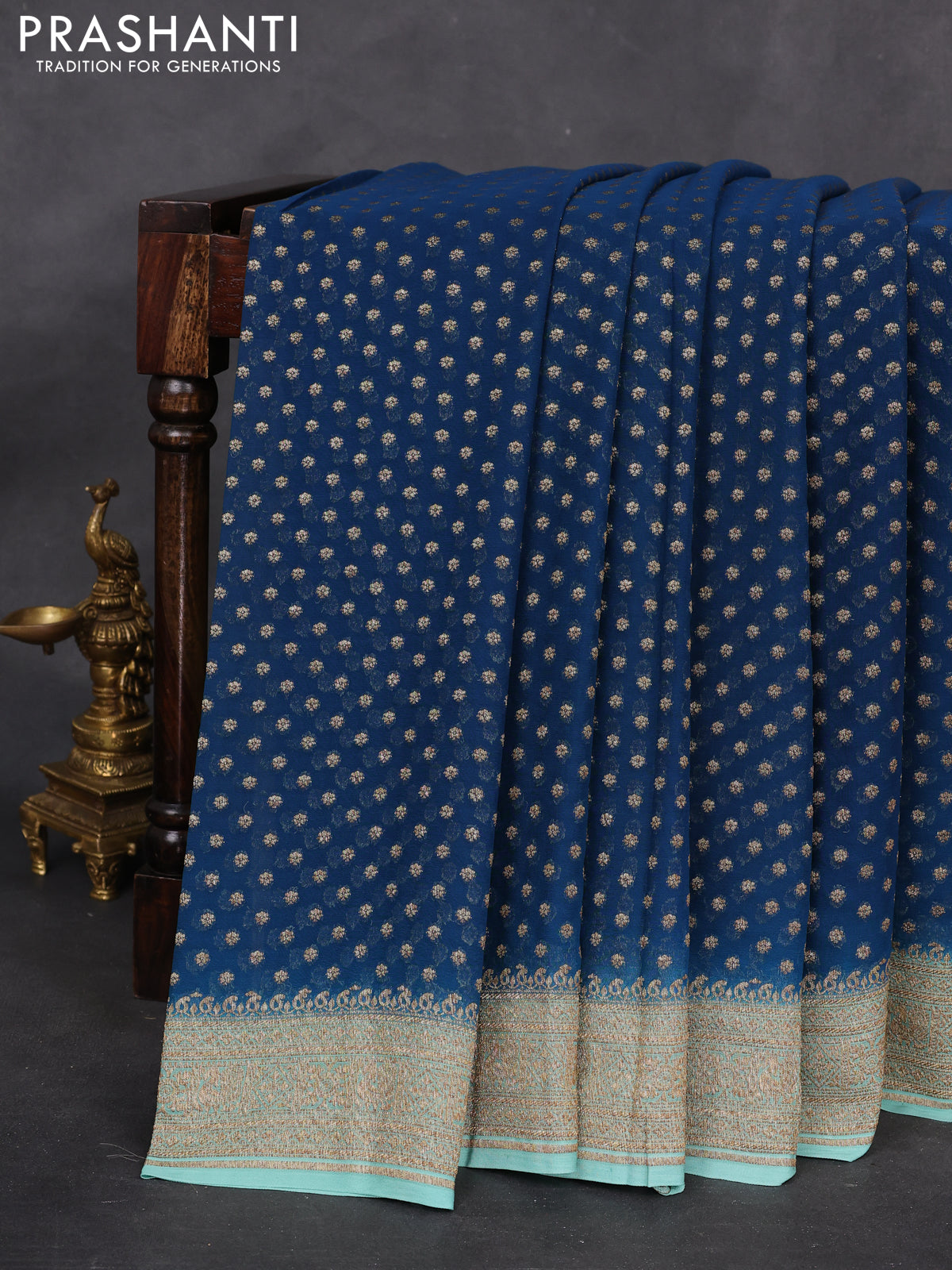Banarasi georgette saree peacock green and teal blue shade with allover woven buttas and woven border