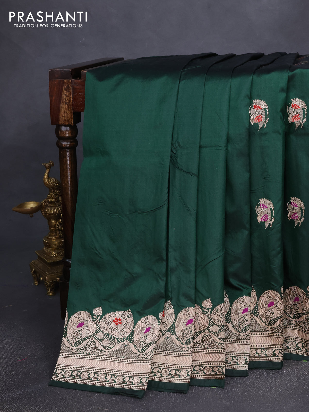 Banarasi katan silk saree bottle green with zari woven buttas and thread & zari woven border