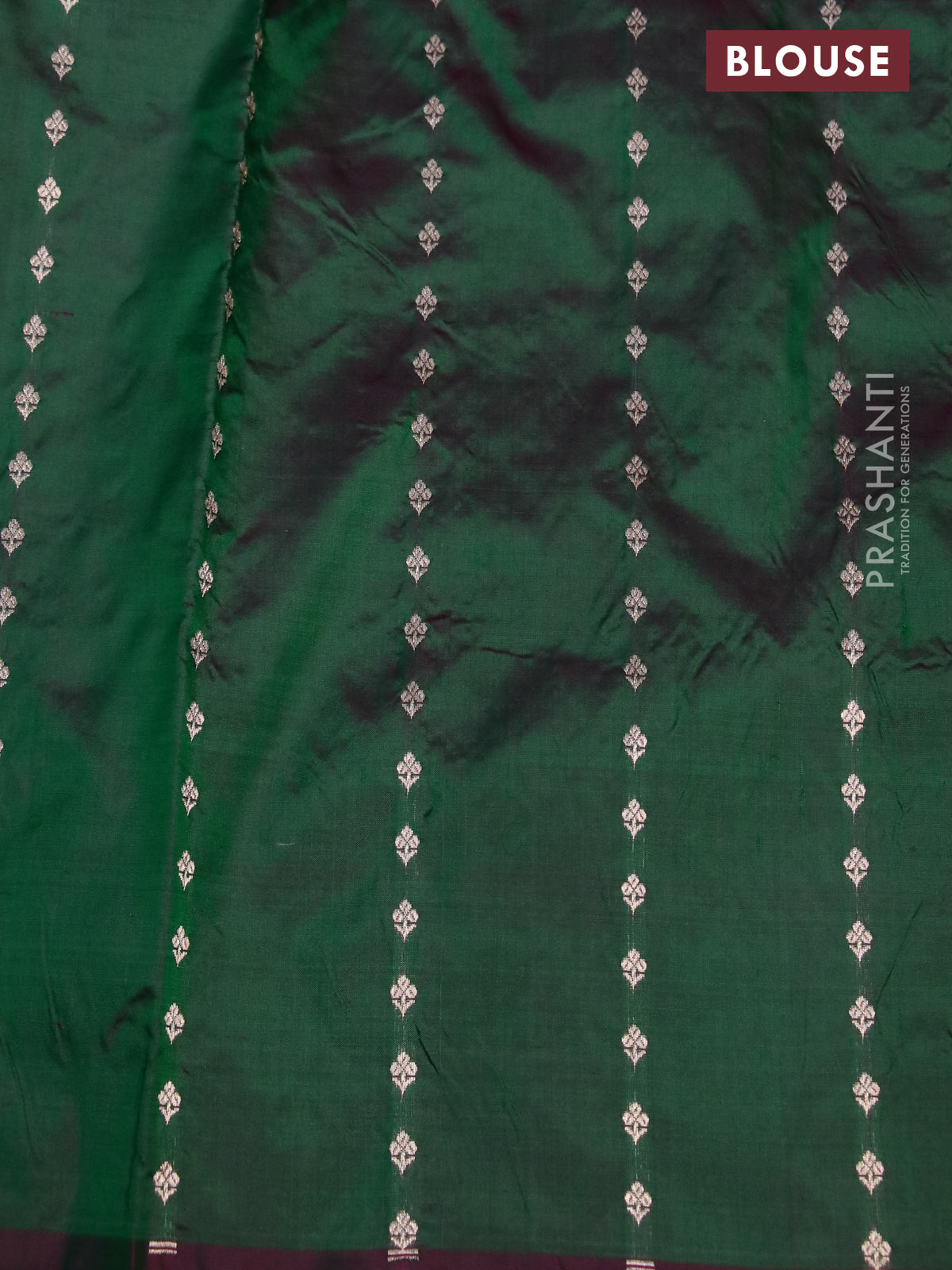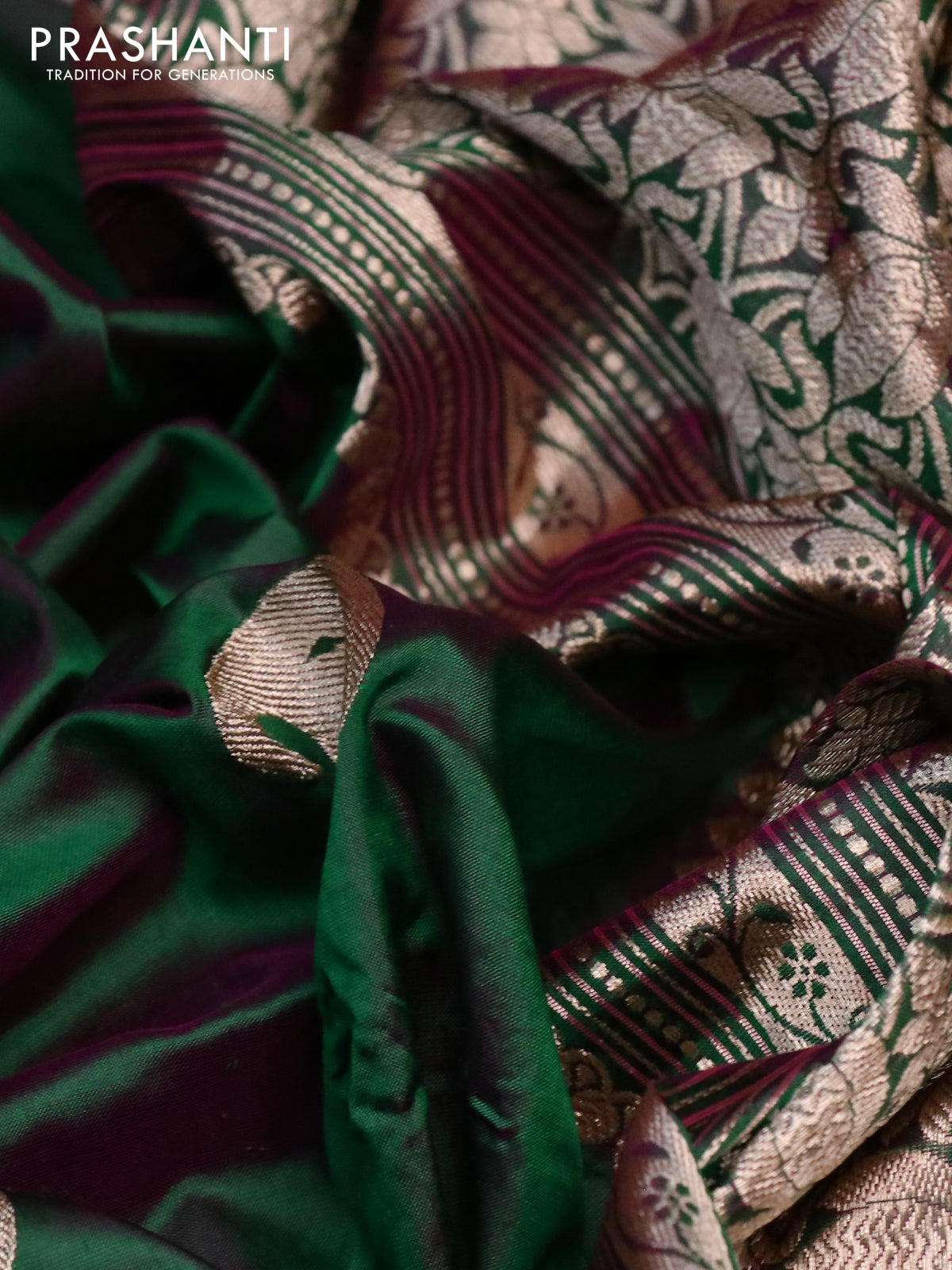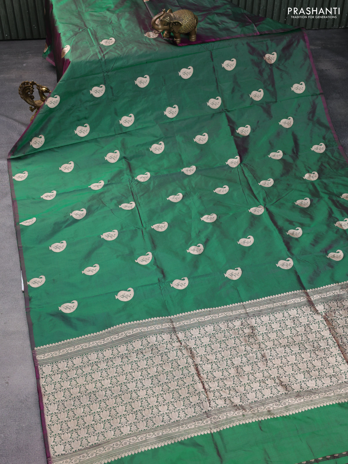 Banarasi katan silk saree dual shade of greenish purple with paisley zari woven buttas in borderless style