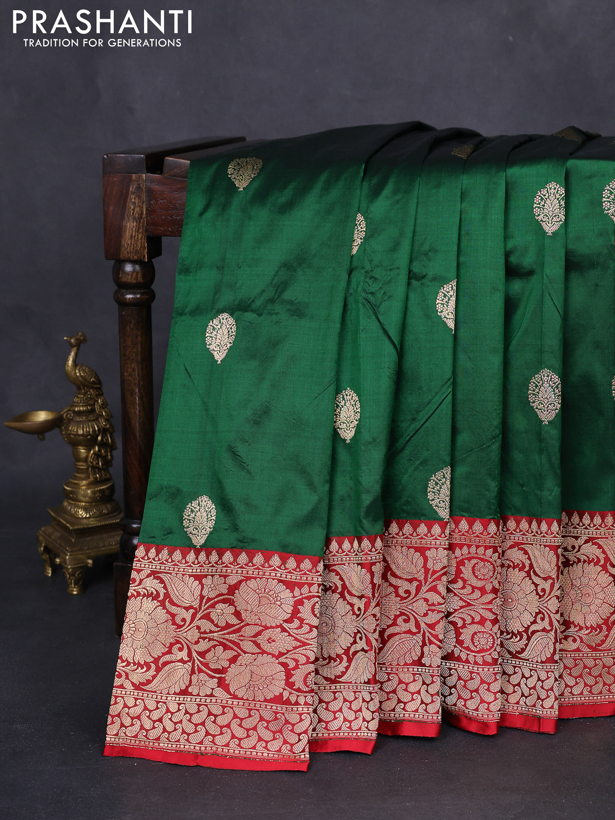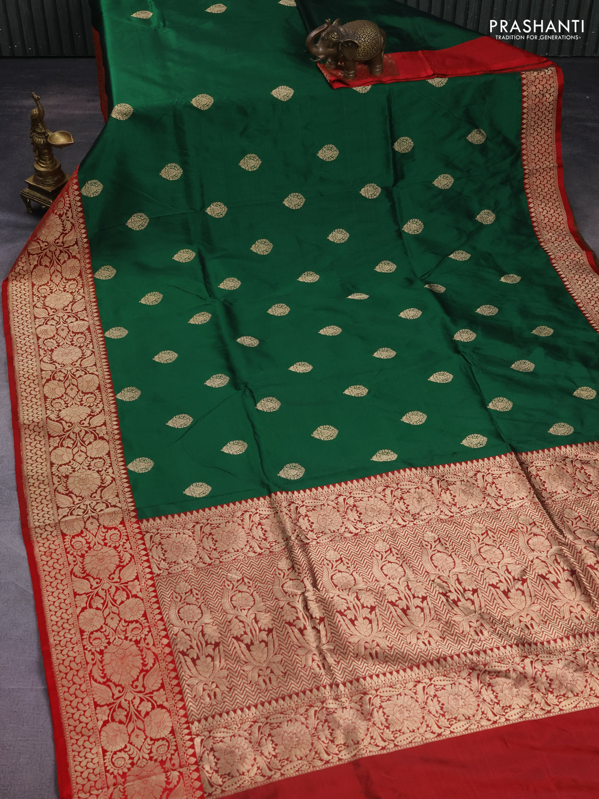 Banarasi katan silk saree green and red with zari woven buttas and floral zari woven border