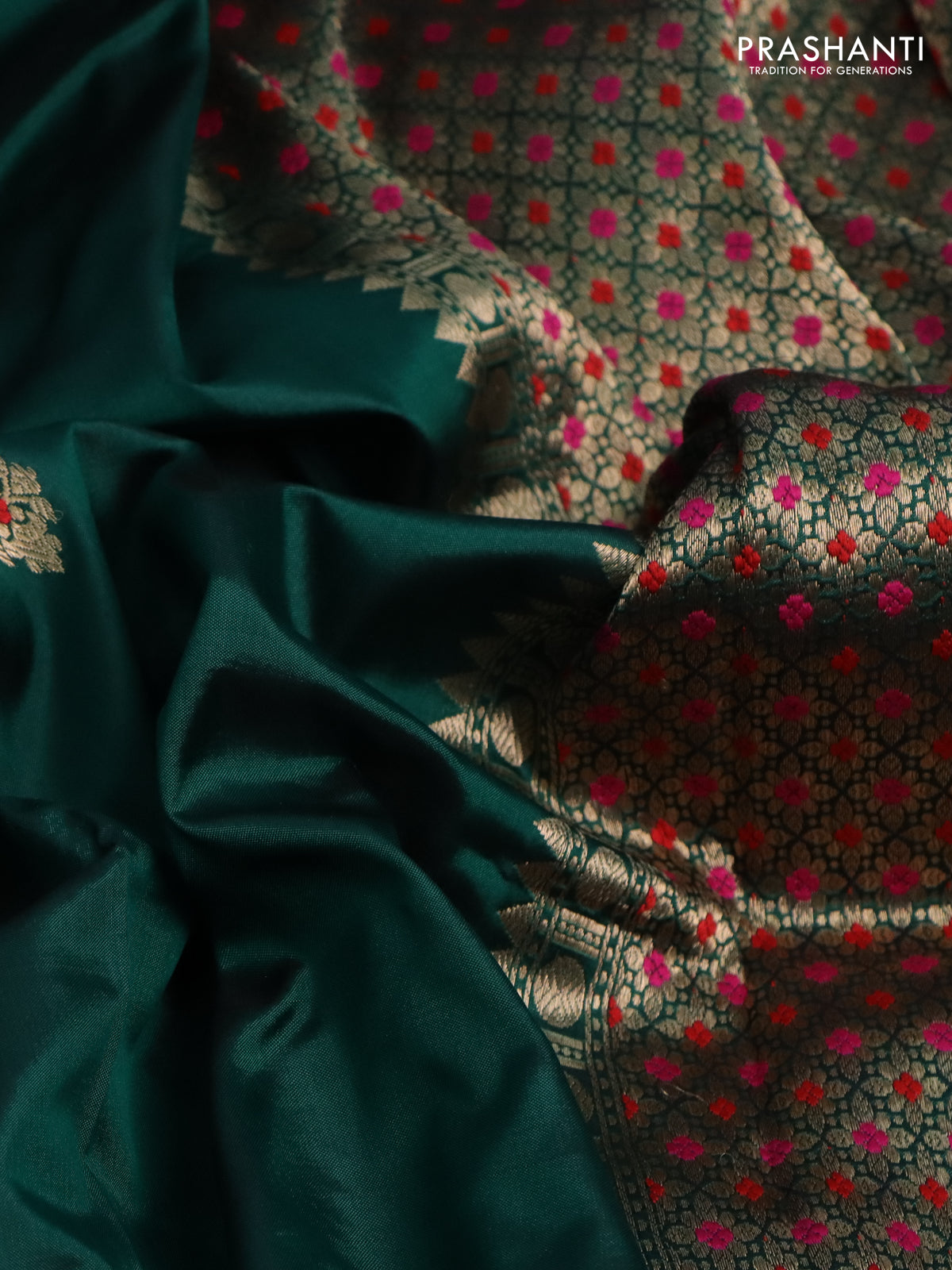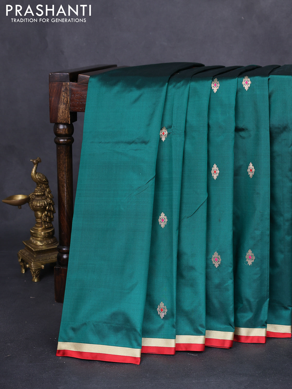Banarasi katan silk saree peacock green and red with zari woven buttas and simple zari border