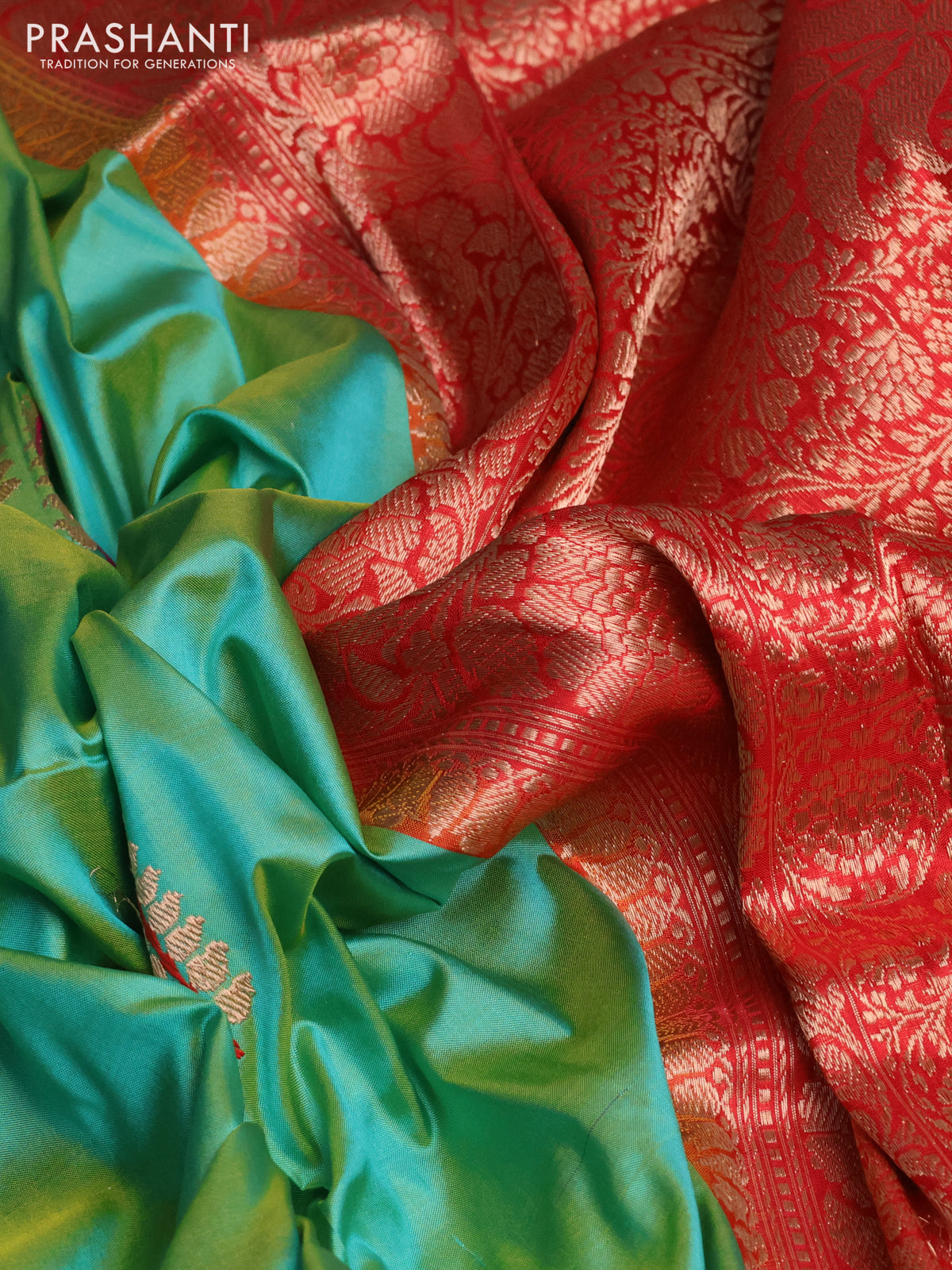 Banarasi katan silk saree teal green and red with copper zari woven buttas and piping border
