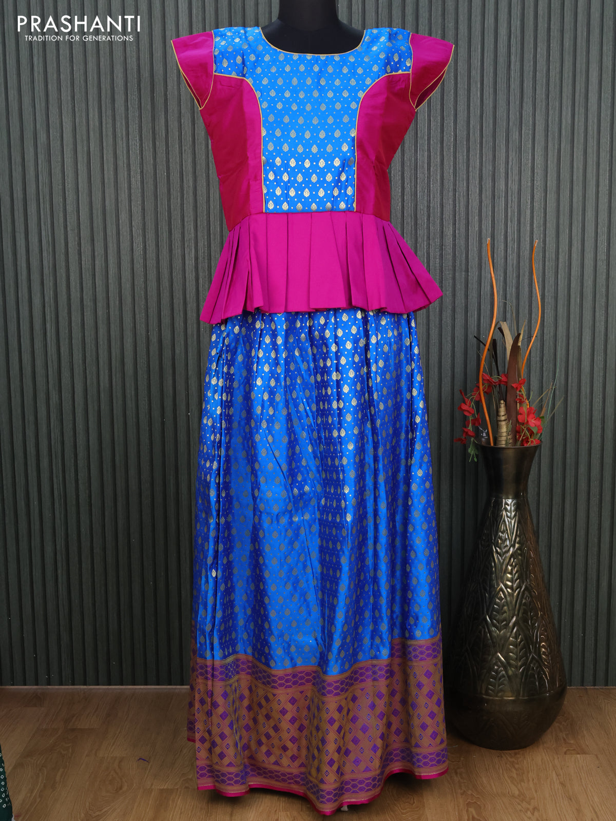 Banarasi kids lehenga magenta pink and cs blue with patch work neck pattern and zari buttas & long zari border for 16 years