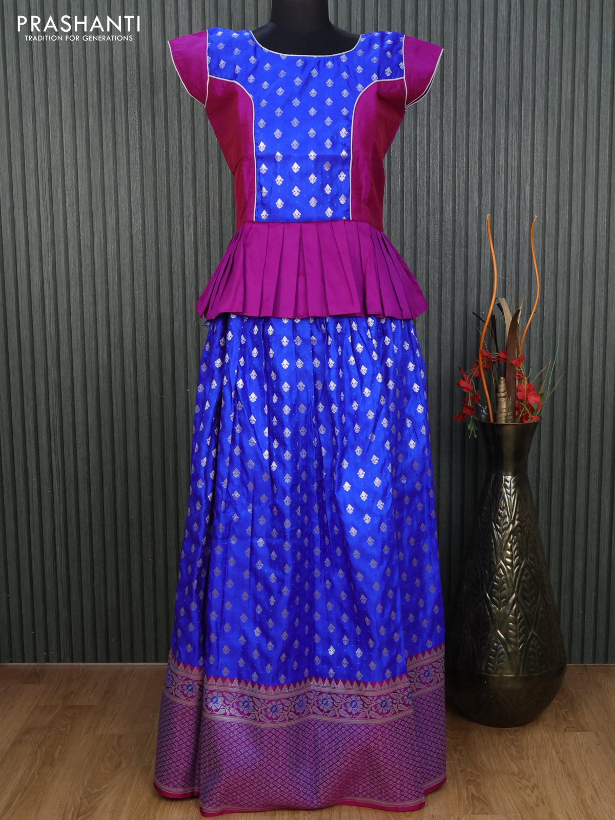 Banarasi kids lehenga purple and blue with patch work neck pattern and silver zari weaves & long silver zari border for 16 years