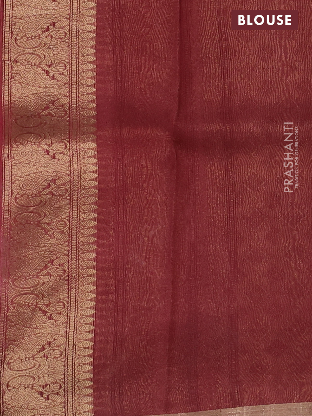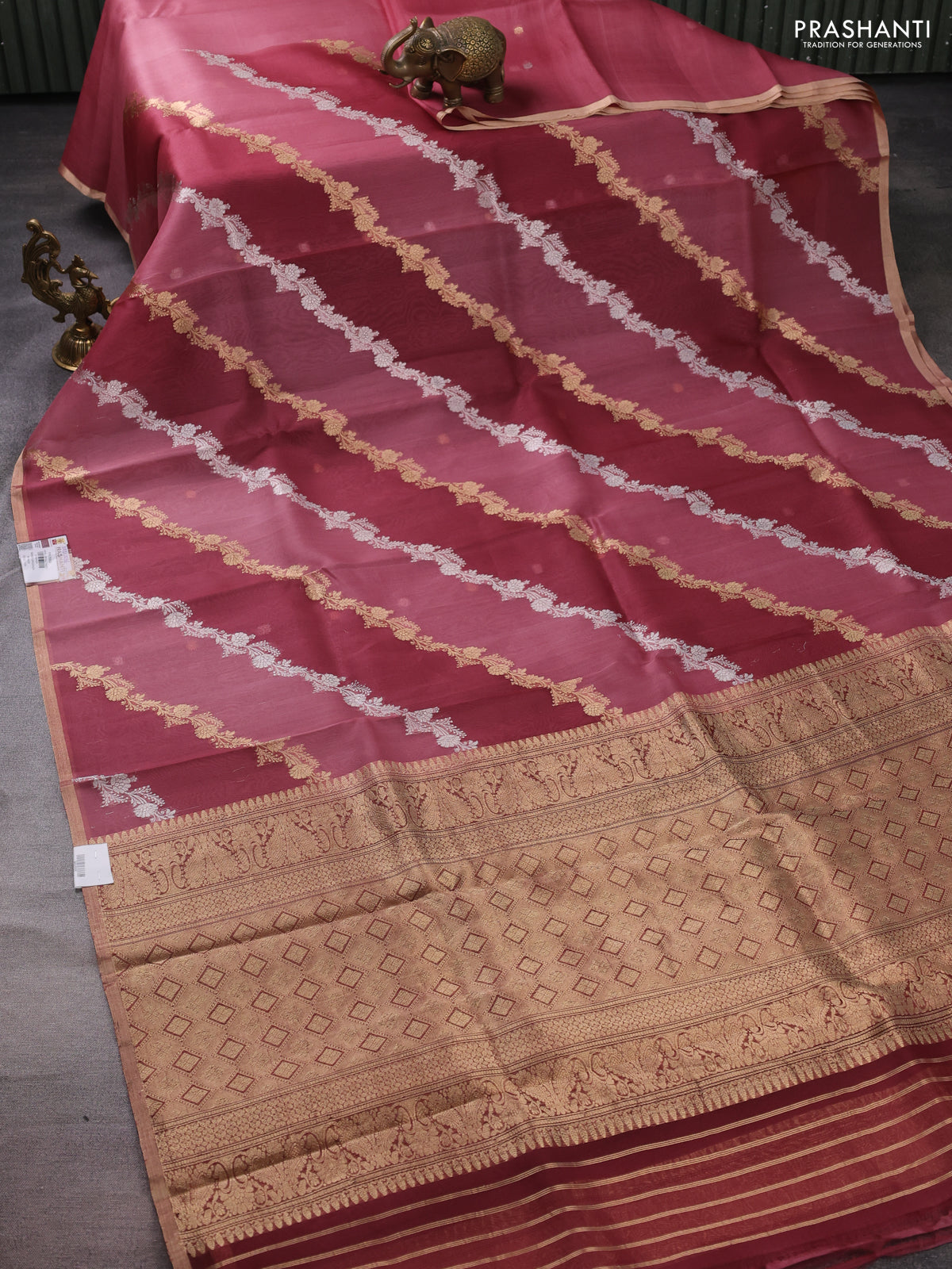 Banarasi organza silk saree pastel maroon and mauve pink with silver & gold zari weaves and zari woven piping boder