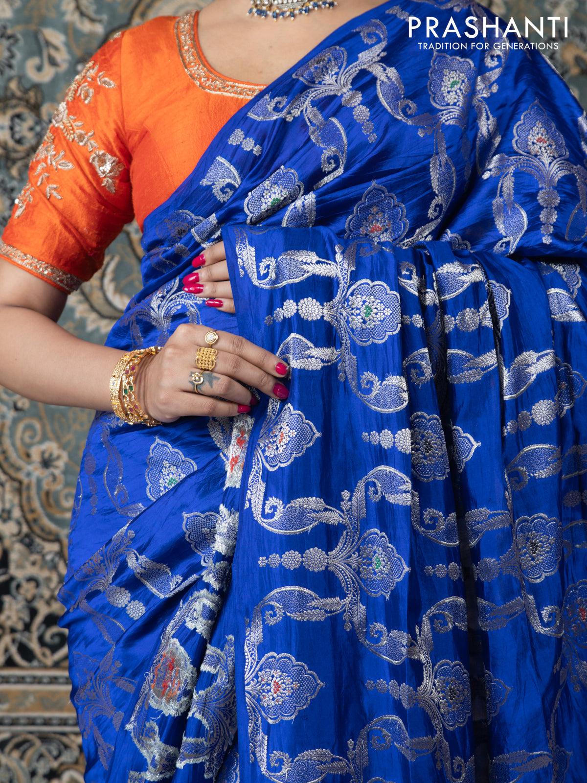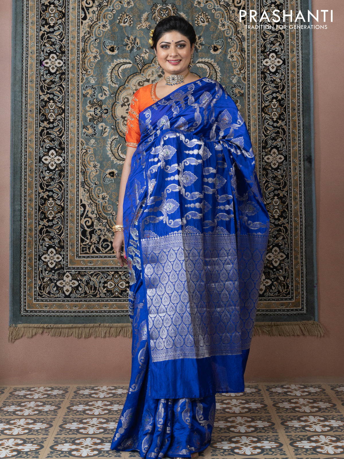 Banarasi poona silk saree blue and mango yellow with allover zari weaves in borderless style