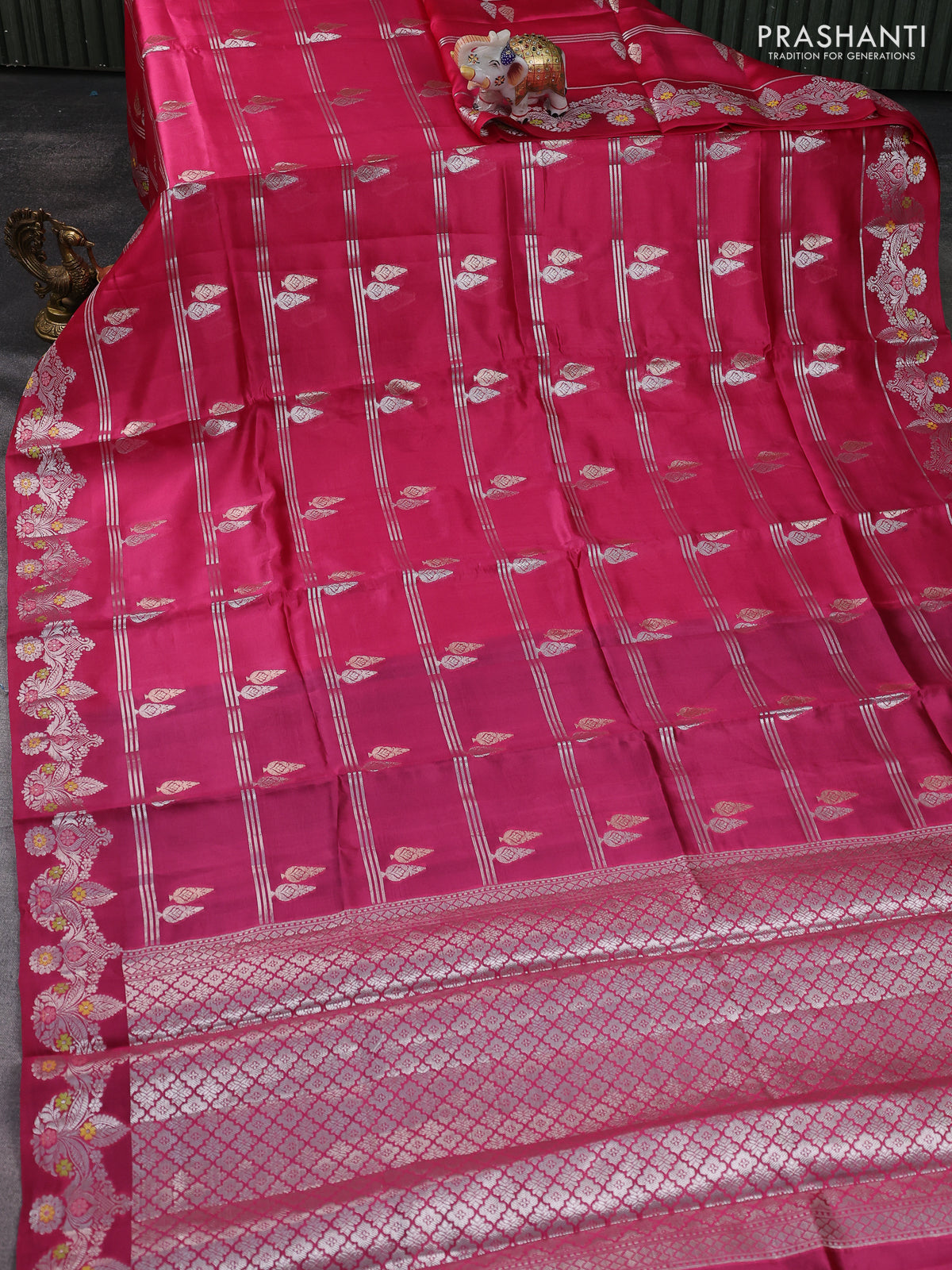Banarasi poona silk saree pink and peacock blue with silver & gold zari woven buttas and silver zari woven border