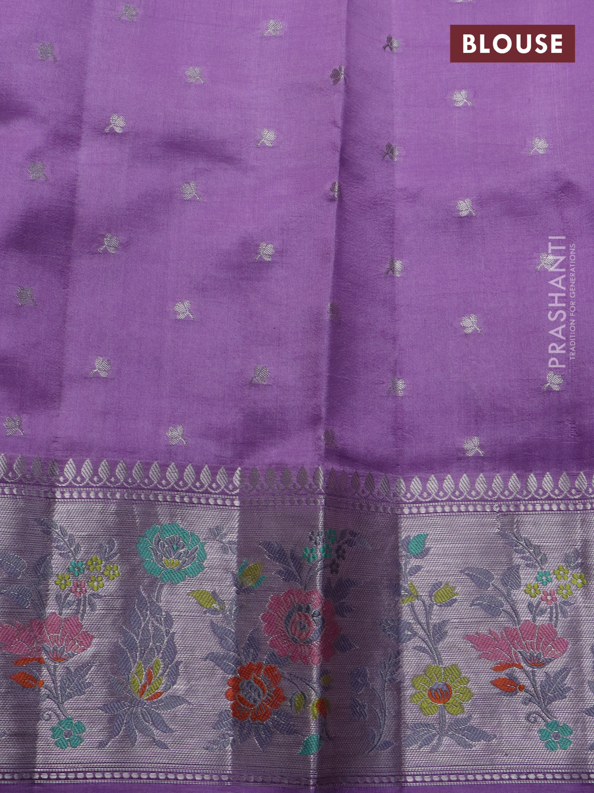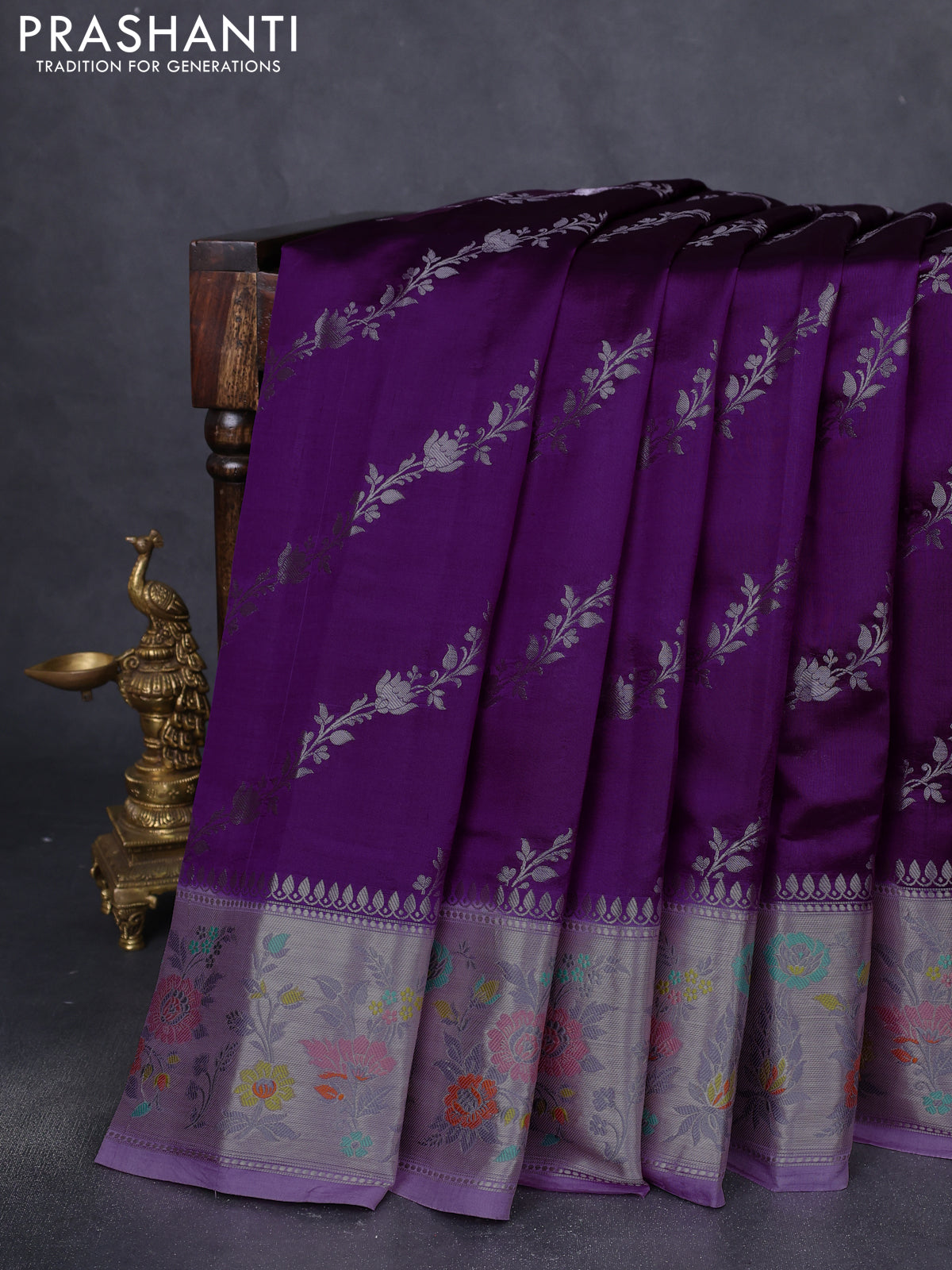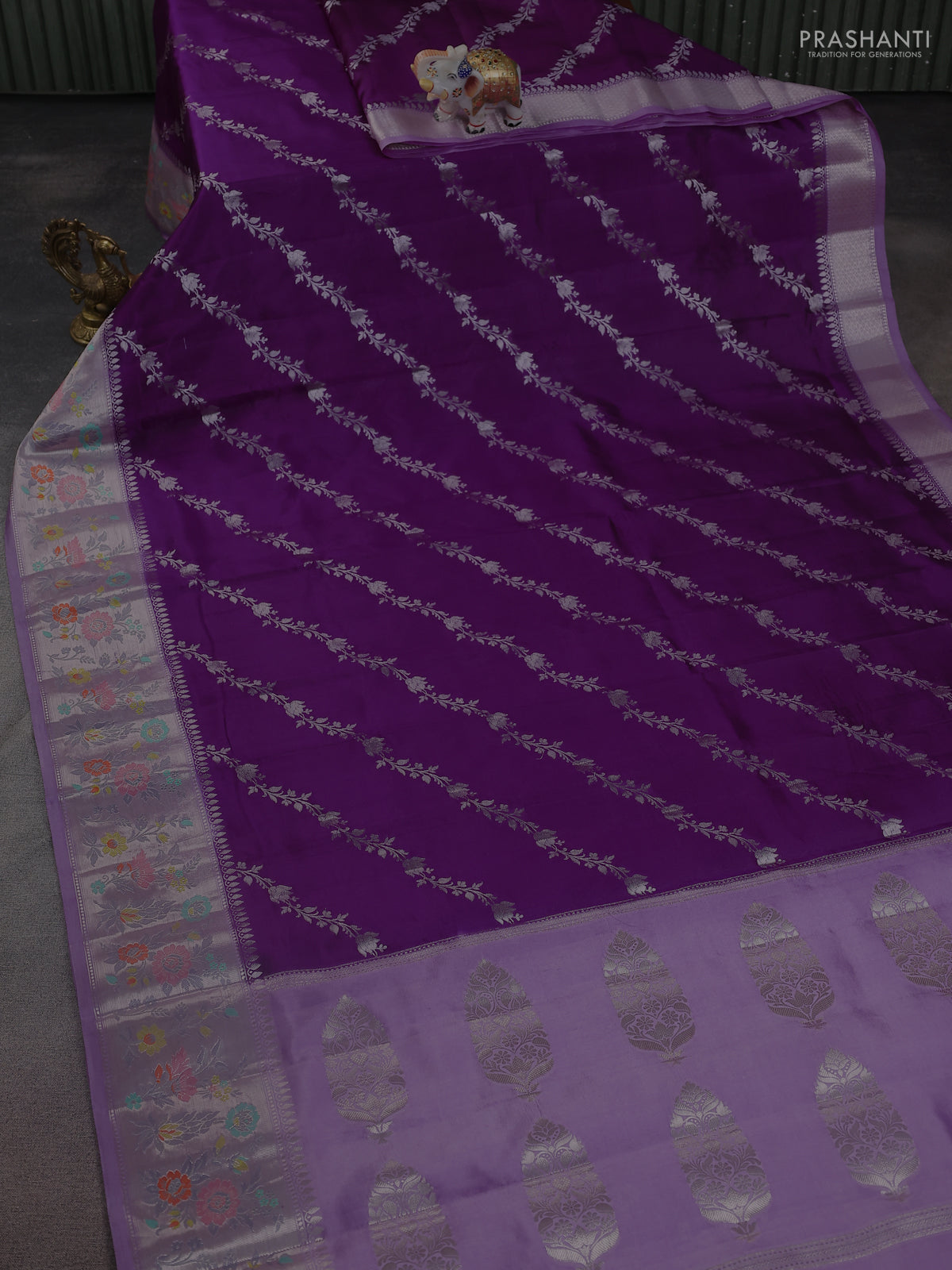 Banarasi poona silk saree purple and lavender with allover silver zari weaves and zari woven floral design border