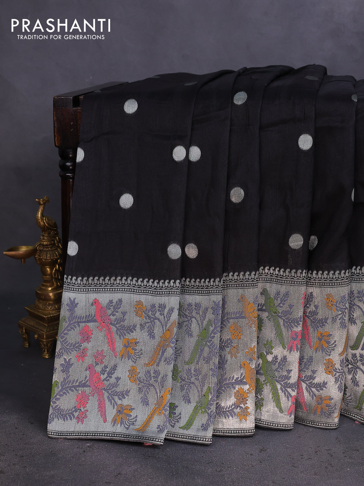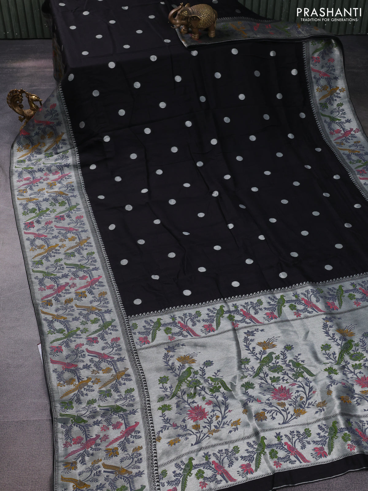Banarasi raw silk saree black with sillver zari woven coin buttas and silver zari woven paithani style border