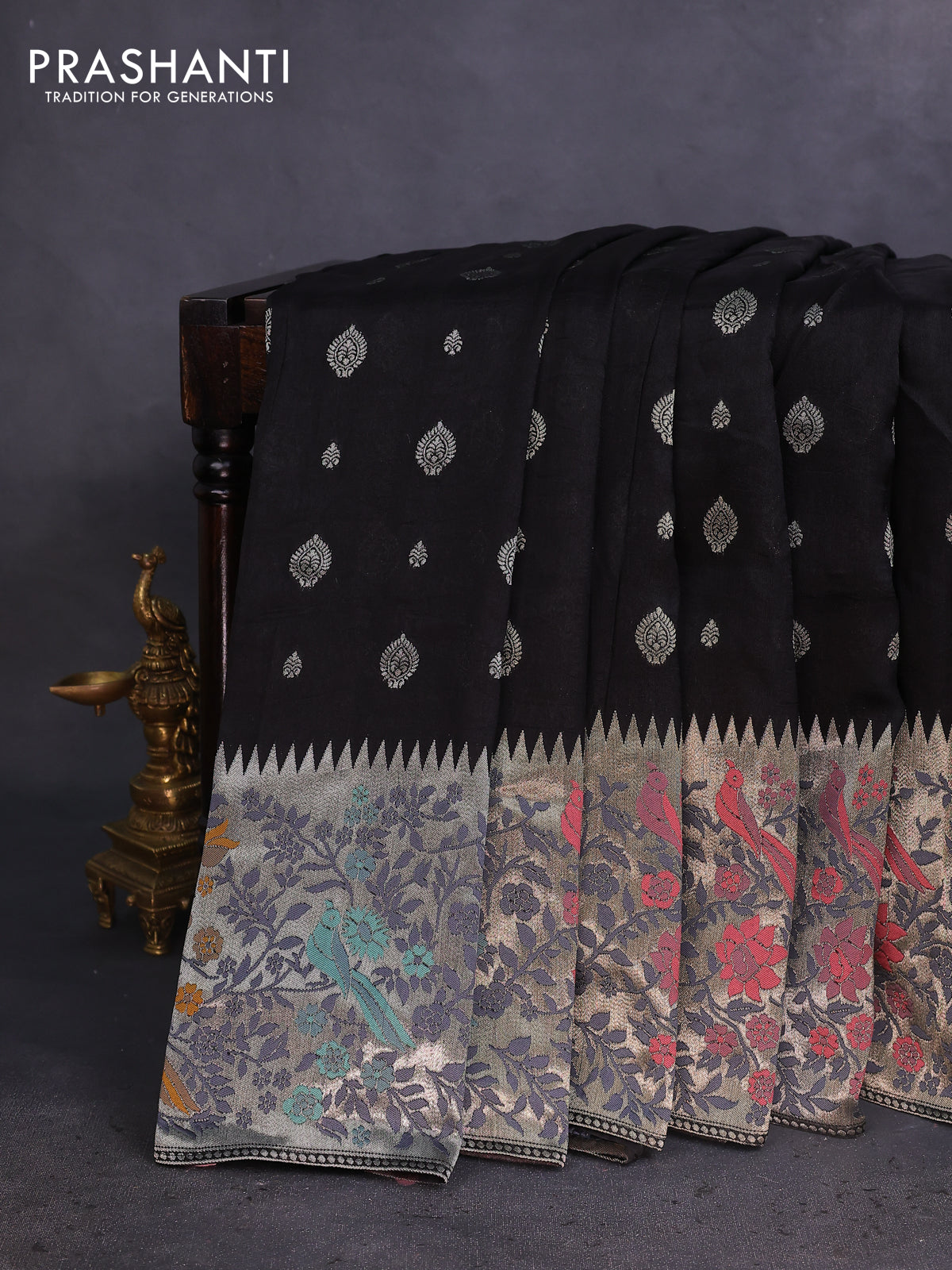 Banarasi raw silk saree black with silver zari woven buttas and silver zari woven paithani style border
