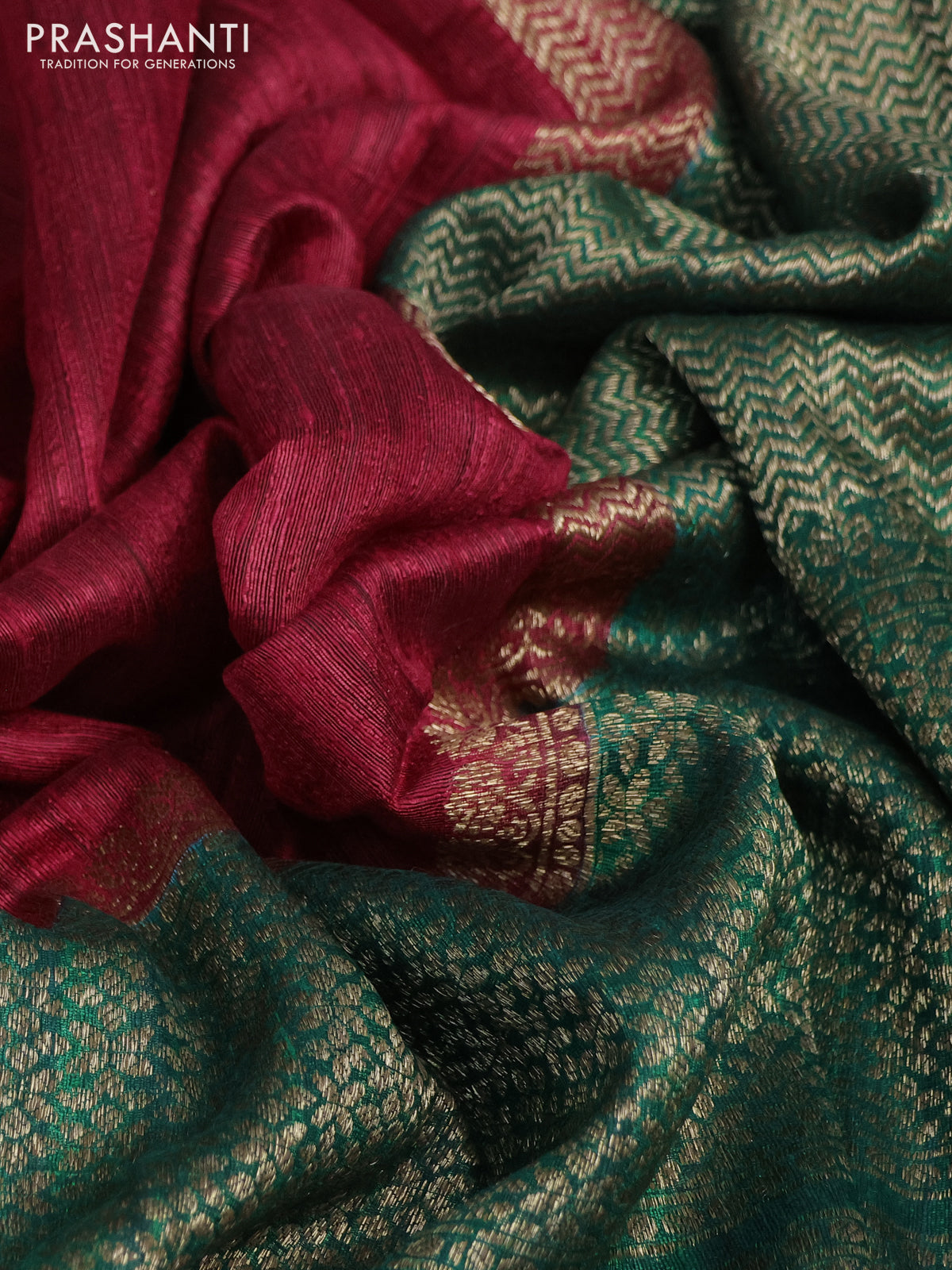 Banarasi raw silk saree maroon and green with plain body and long zari woven border