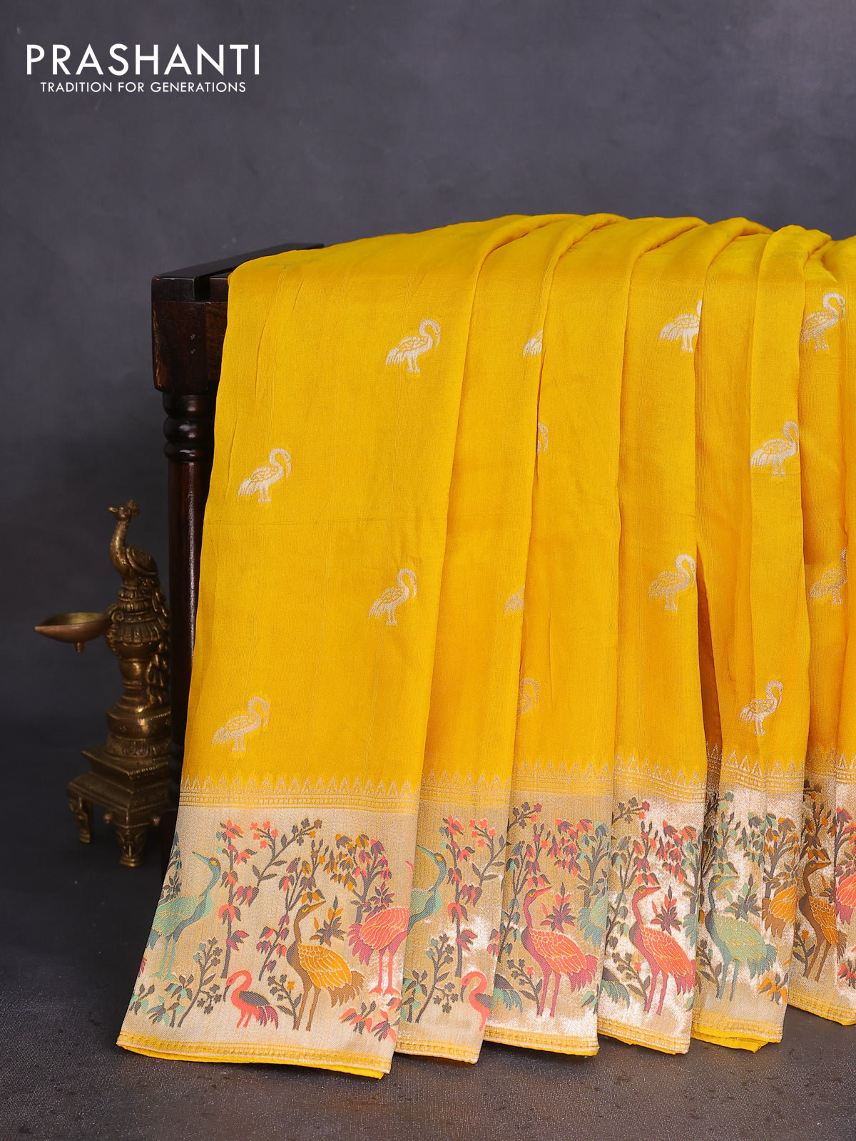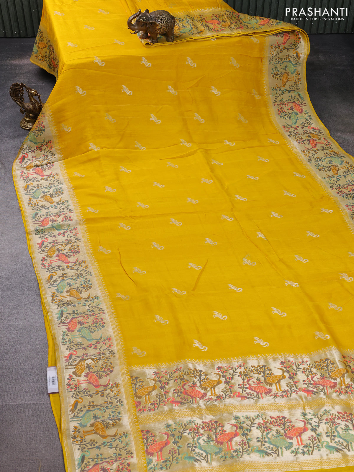 Banarasi raw silk saree yellow with silver zari woven buttas and silver zari woven paithani style border