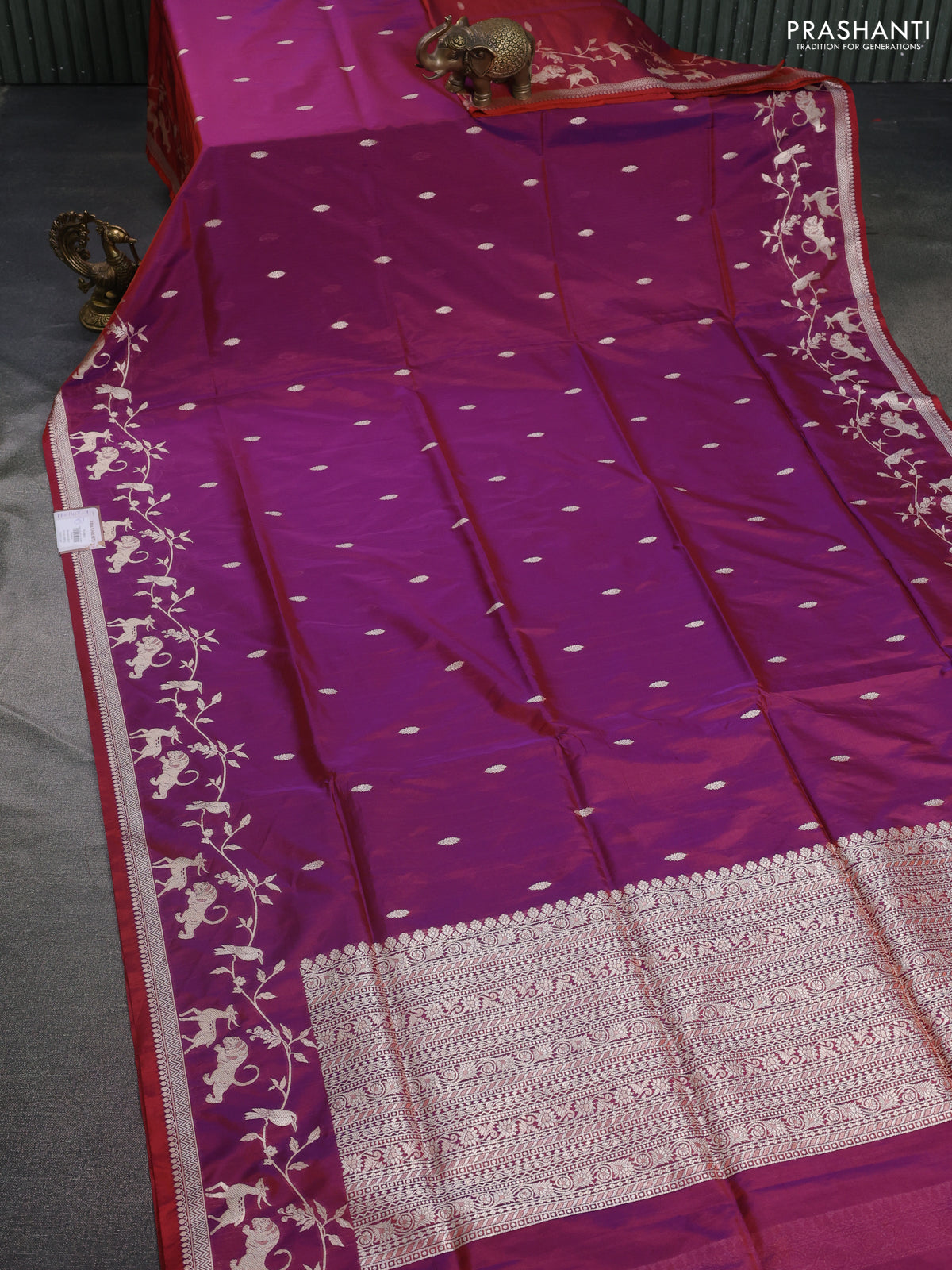 Banarasi semi katan silk saree dual shade of maroonish purple with allover zari woven buttas and rich zari woven border