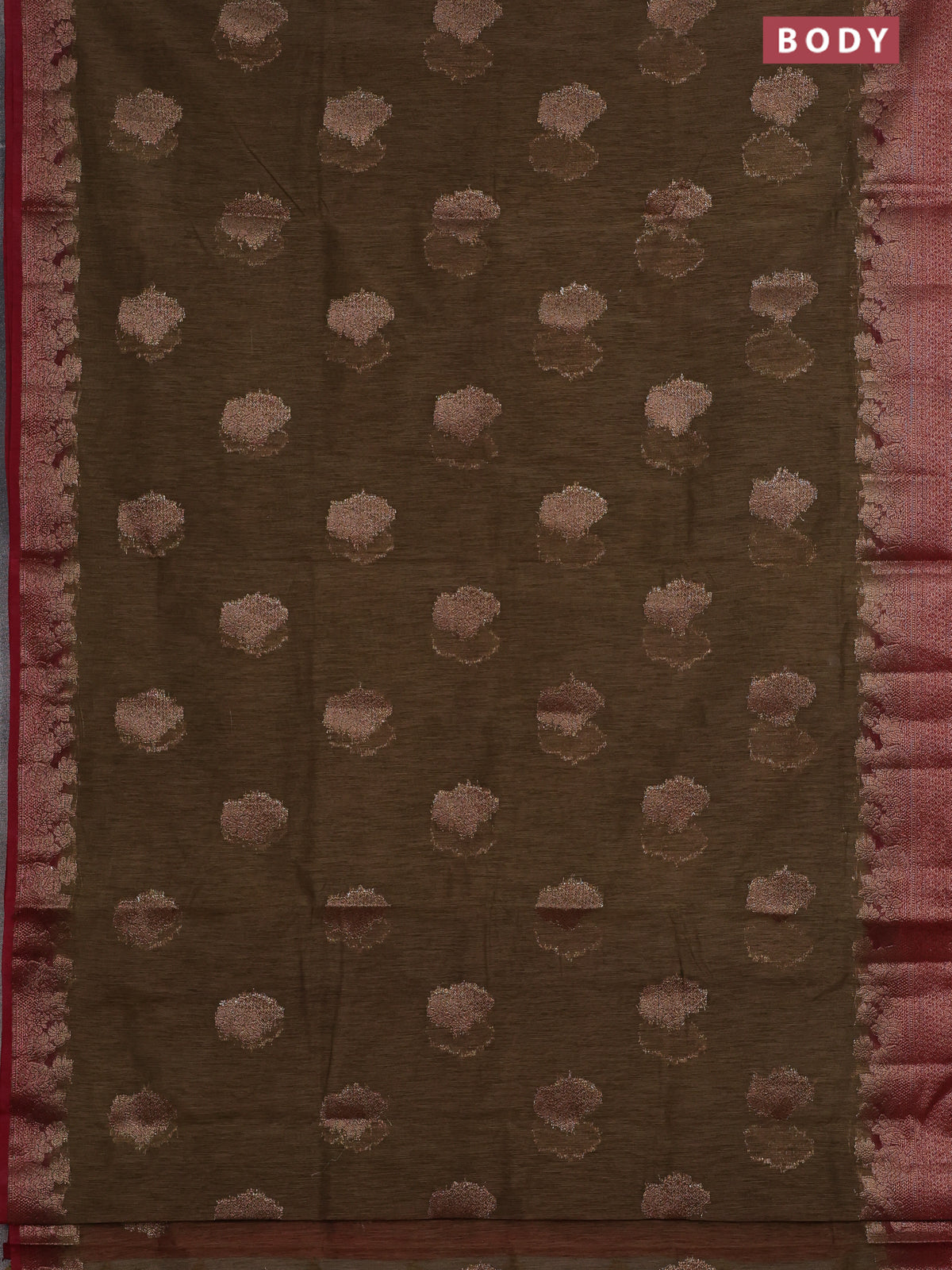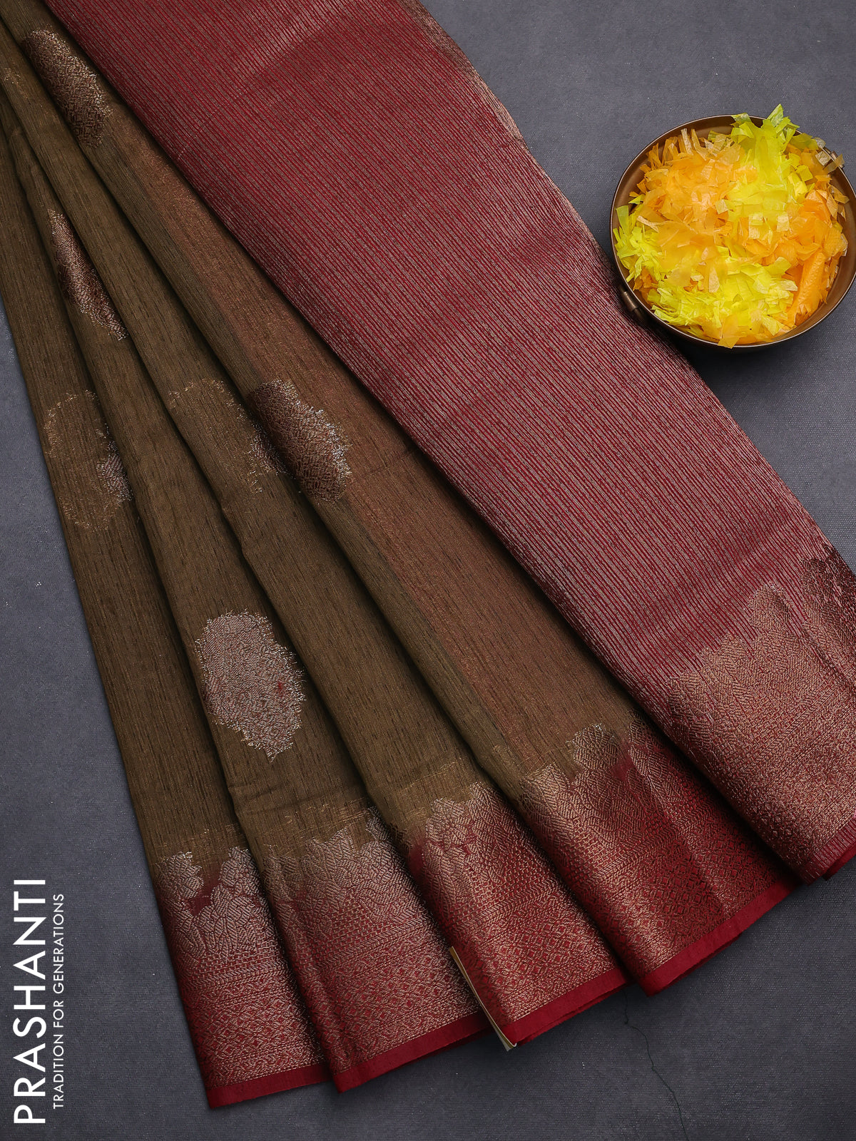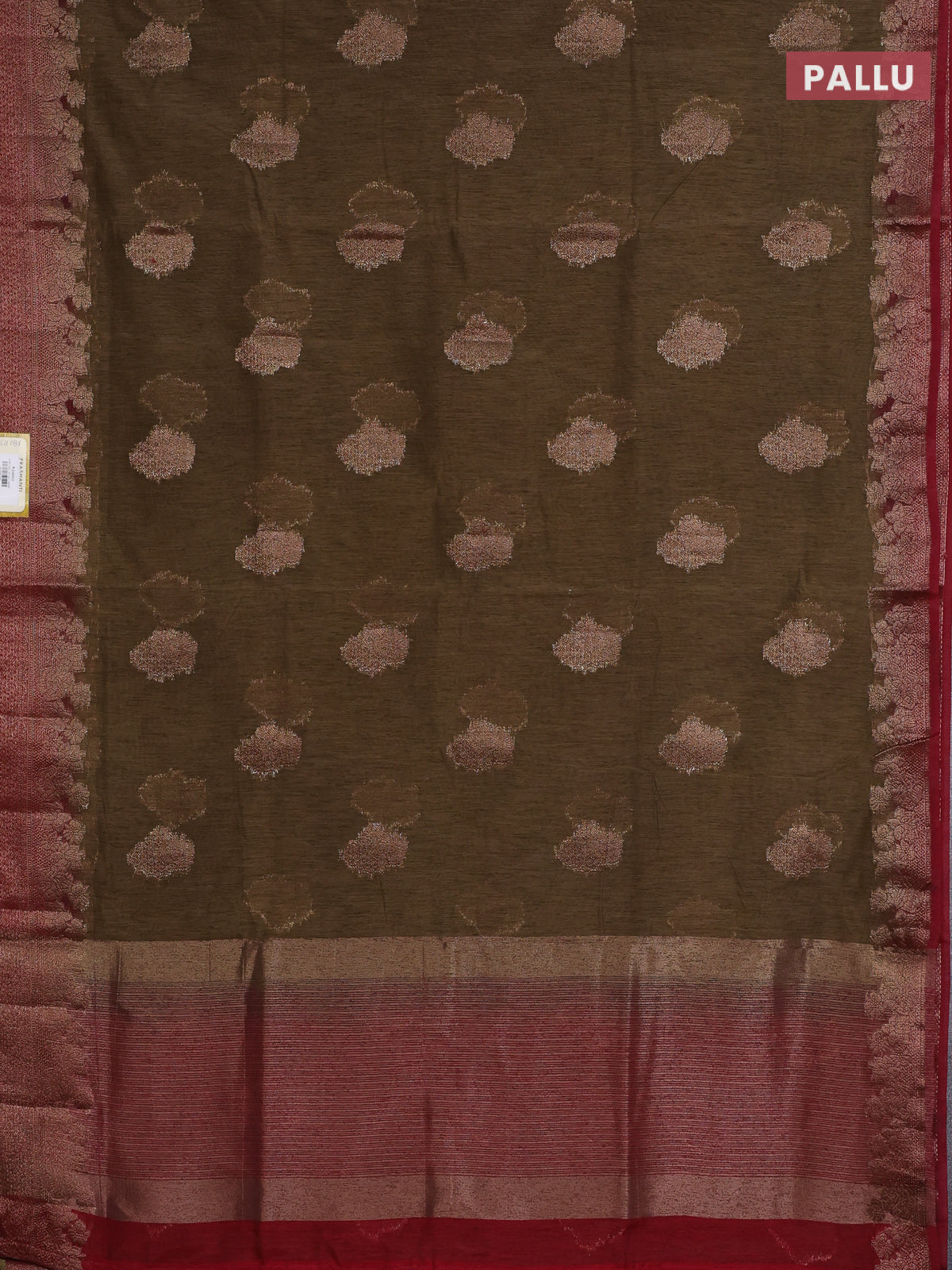 Banarasi semi matka saree military green and maroon with thread & zari woven floral buttas and banarastyle border