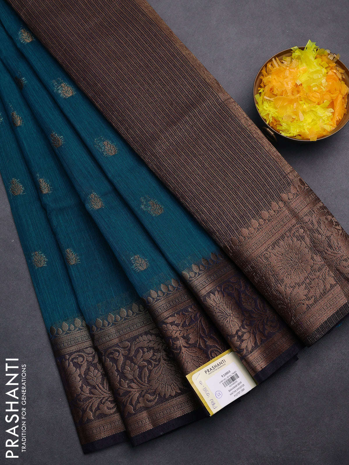 Banarasi semi matka saree teal green shade and navy blue with thread & zari woven buttas and banarastyle border