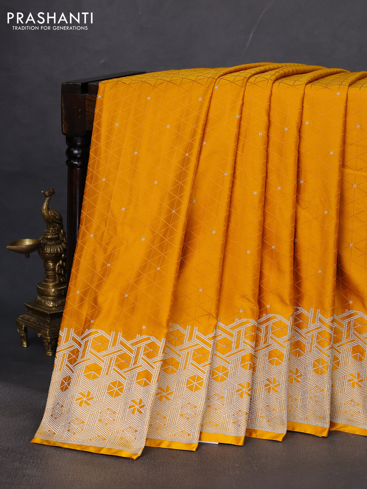 Banarasi semi mushru silk saree mustard yellow with allover self emboss & zari buttas and zari woven border