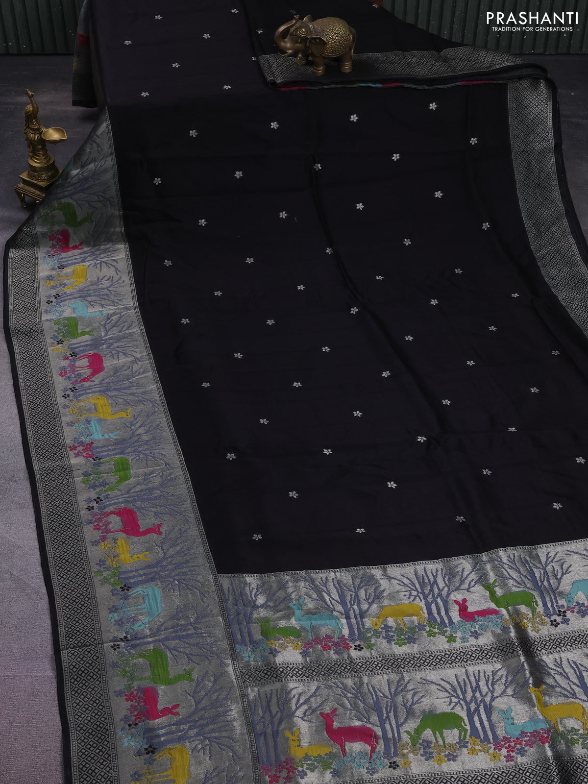Banarasi semi raw silk saree black with silver zari woven buttas and silver zari woven border