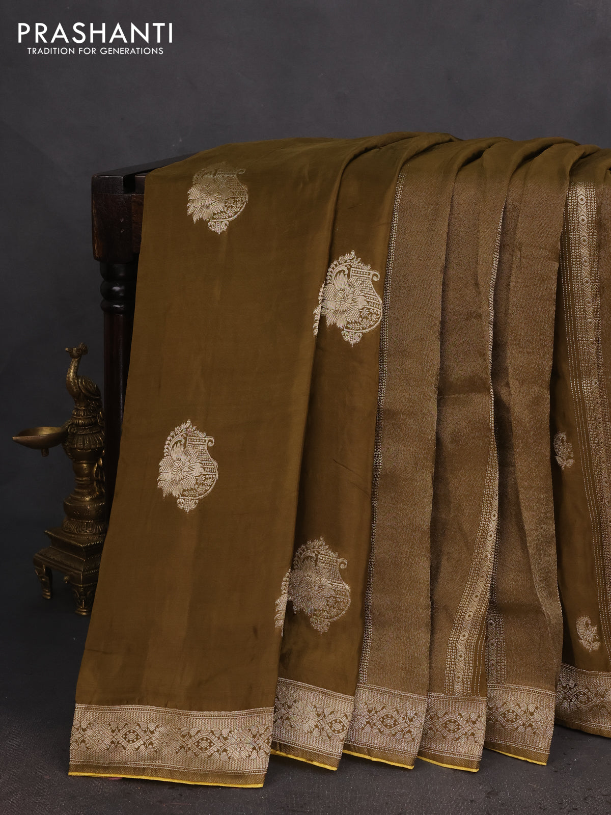 Banarasi silk saree dark mehendi green and yellow with allover zari weaves and zari woven border