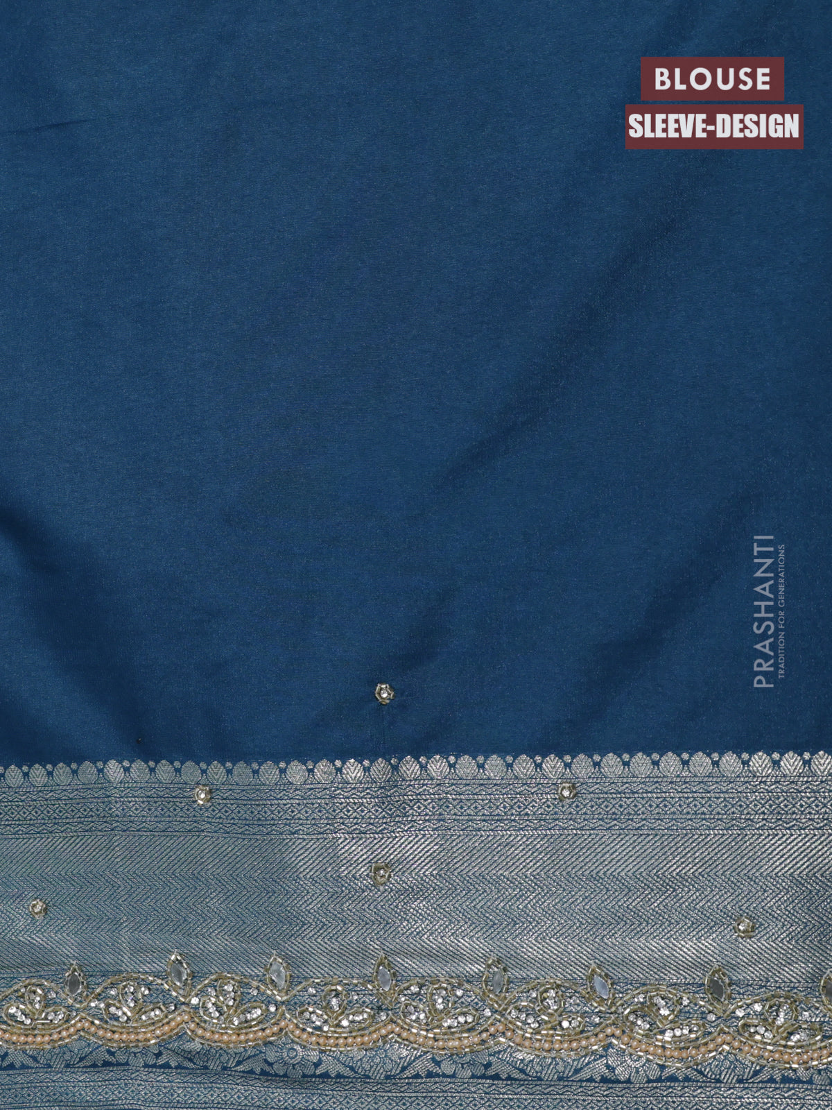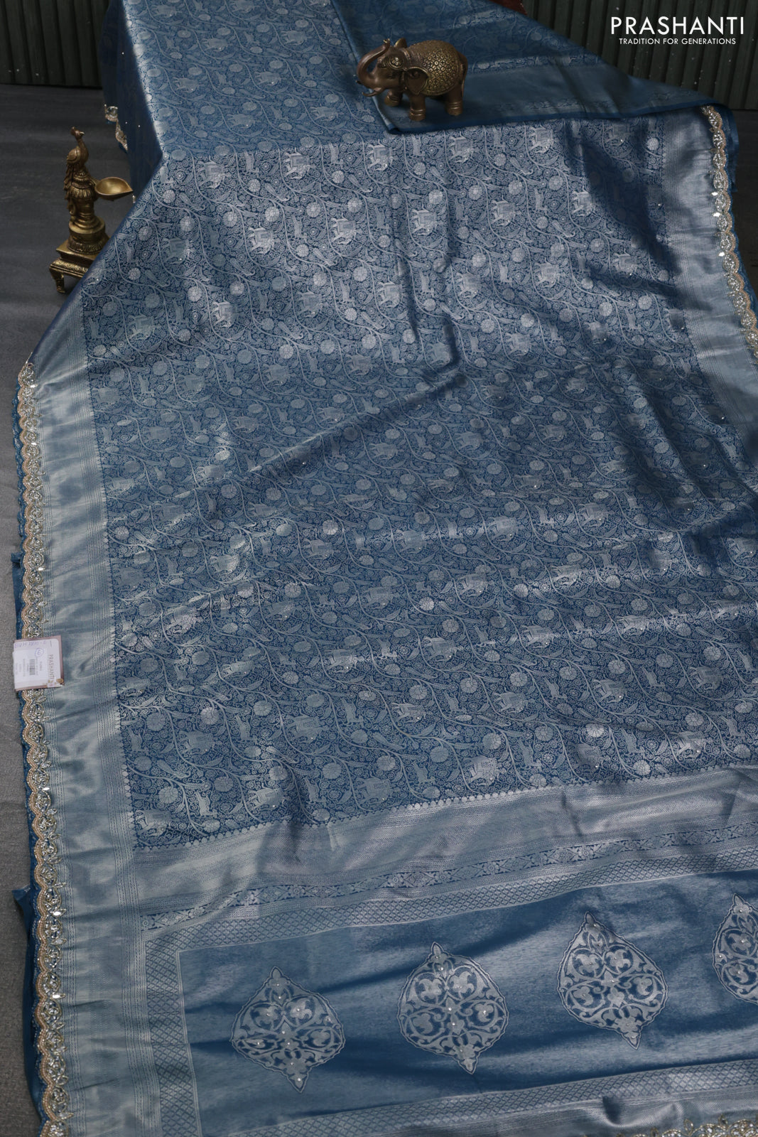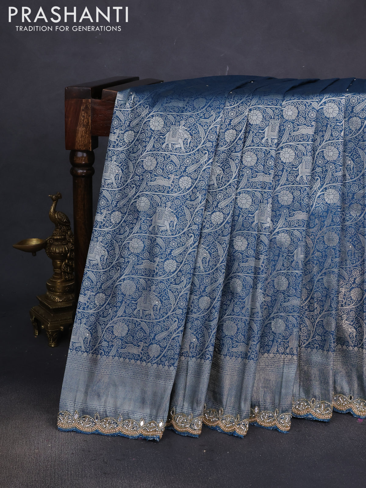 Banarasi silk saree dark peacock blue with allover zari woven brocade weaves and embroidery mirror work border